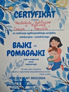 W dniu 30 maja 2024 r. zakończyliśmy realizację projektu „ Bajki Pomagajki” . W ramach projektu dzieci usłyszały 10 bajek - pomagajek. Poznały również nowych bohaterów bajeczek tj. : Kocię Złośnicę, Pieska Bąbelek, Króliczka Czarnouszka, Małą Myszkę, Króliczka...