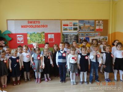 W dniu 10 listopada w naszym przedszkolu obchodziliśmy Narodowe Święto Niepodległości. Dzieci tego dnia przyszły do przedszkola ubrane na galowo. Słowem i piosenką o treści patriotycznej dzieci oddały szacunek symbolom narodowym , symbolom walki o wolność i zwycięstwo oraz miłość do Ojczyzny....