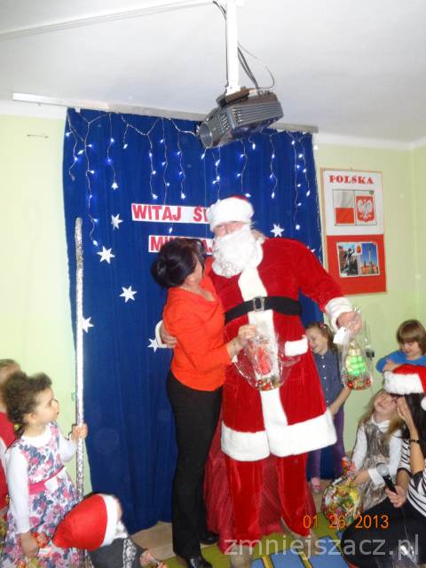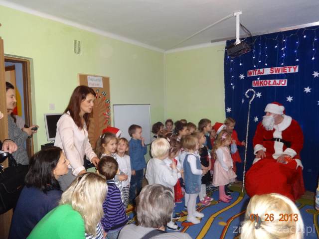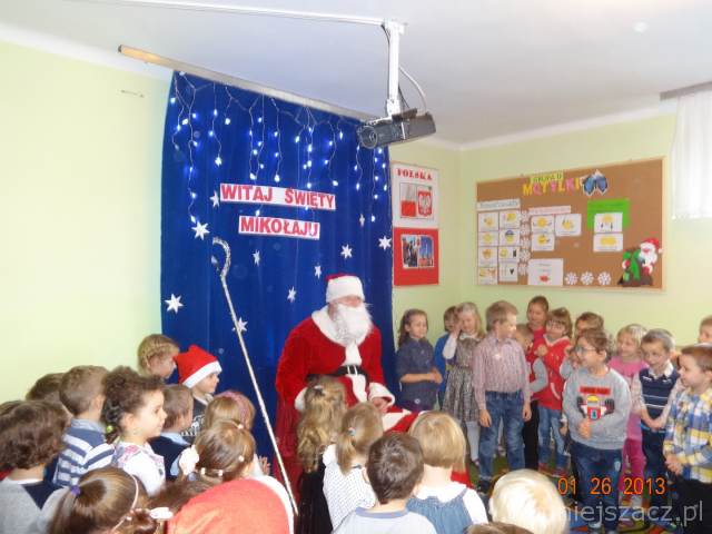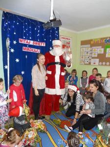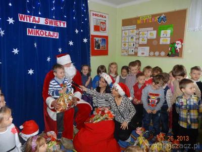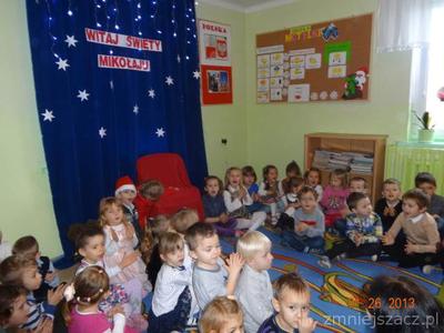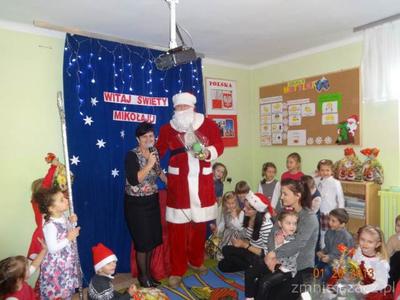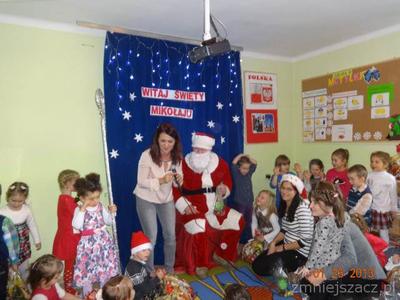 5 grudnia z wielkim workiem prezentów w naszym przedszkolu pojawił się długo oczekiwany przez dzieci gość w czerwonym ubraniu z siwą brodą- oczywiście Święty Mikołaj. Upragniony gość obdarował wszystkie dzieci paczkami. A Mikołaj w zamian za prezenty prosił  dzieci o wiersze i piosenki.Nie zabrakło oczywiście pamiątkowych zdjęć w trakcie których uśmiech nie znikał z twarzy dzieci.