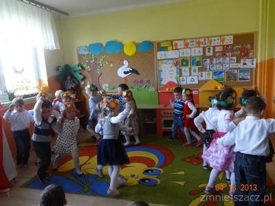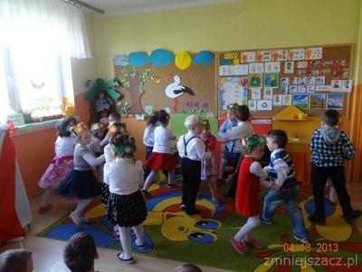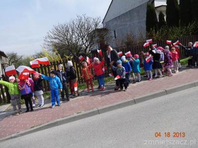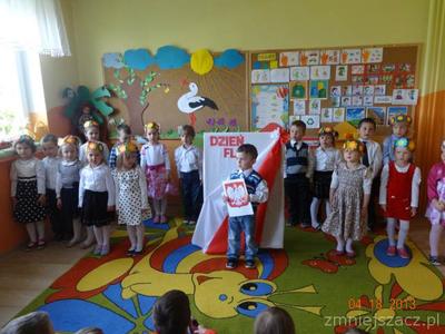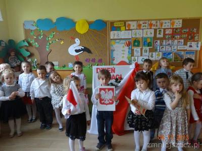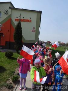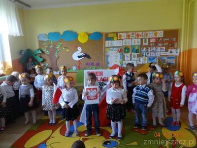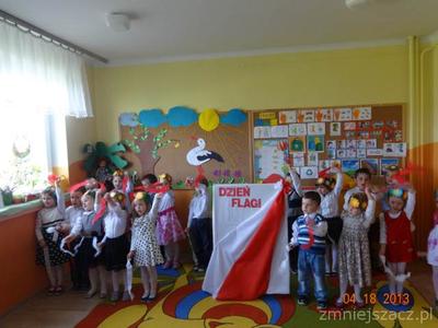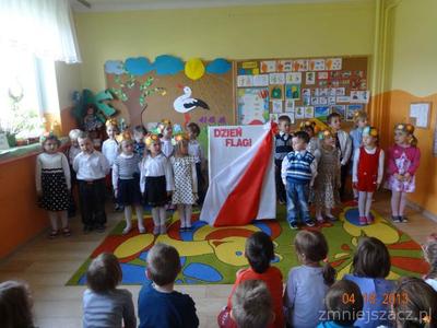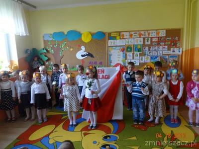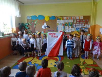 W czwartek 30 kwietnia świętowaliśmy dzień Flagi. Grupa młodsza przedstawiła program artystyczny o tematyce patriotycznej. W programie znalazły się: wiersze , piosenki oraz taniec ,,Krakowiak”, który jest jednym z tańców narodowych. Później w postawie na baczność cała społeczność przedszkolna zaśpiewała wspólnie hymn ,,Mazurek Dąbrowskiego”Na koniec  dzieci wraz z nauczycielkami wzięły udział w uroczystym przemarszu drogami naszej miejscowości trzymając w rękach flagi biało-czerwone