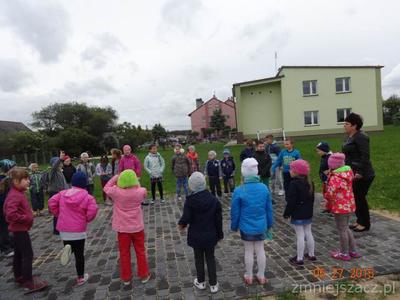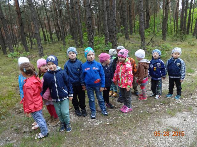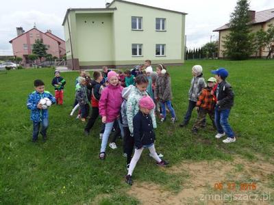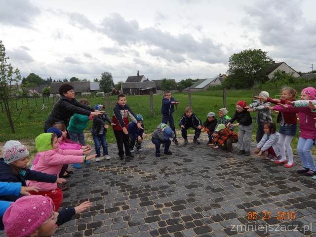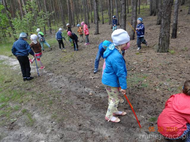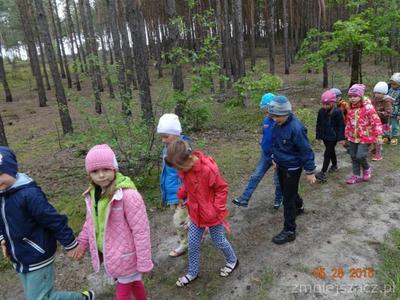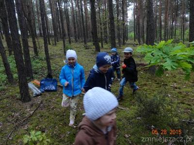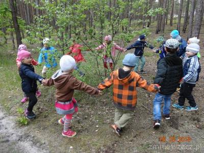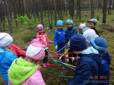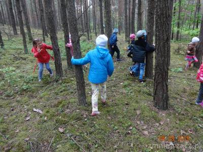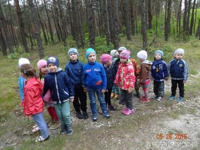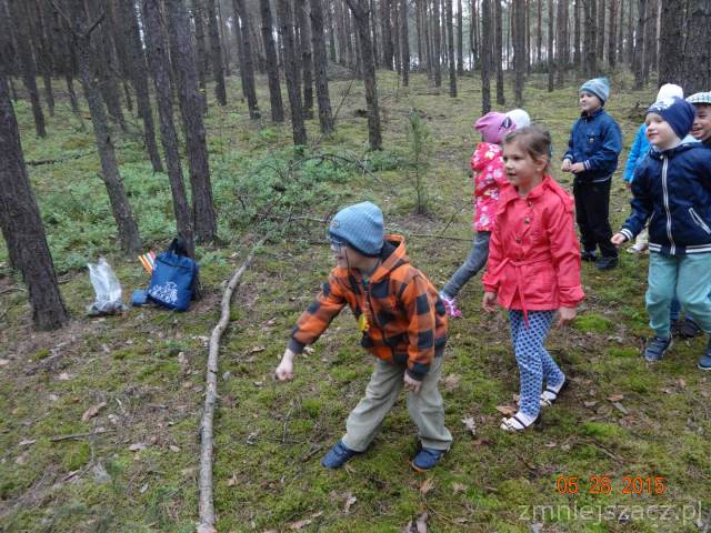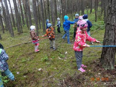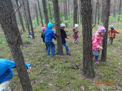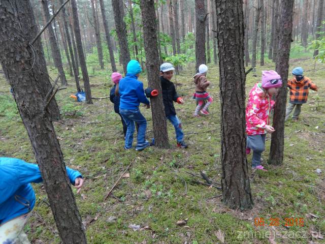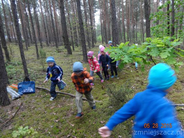 Dnia 28 maja grupa dzieci 5-6 letnich wraz z wychowawcą wybrała się do lasu. Tam na leśnej polanie odbyły się różne zabawy z elementem współzawodnictwa: rzucanie szyszkami do określonego celu, pokonywanie naturalnych torów przeszkód, toczenie szyszkiz wykorzystaniem lasek, zabawa w chowanego itp.Po takiej zabawie dzieci w dobrych humorach wróciły na pyszny obiad.