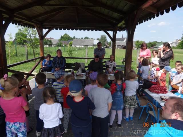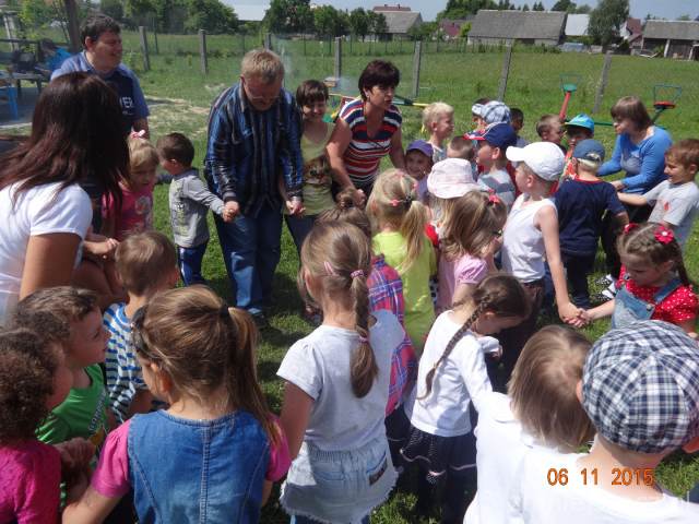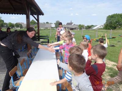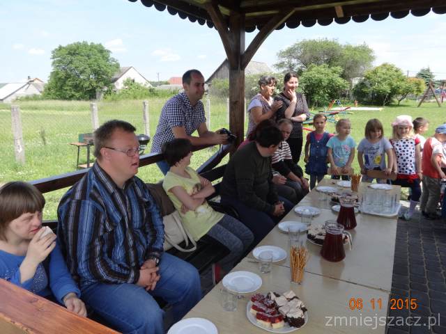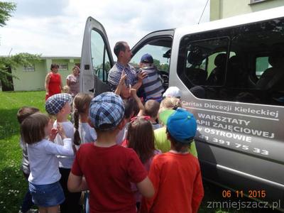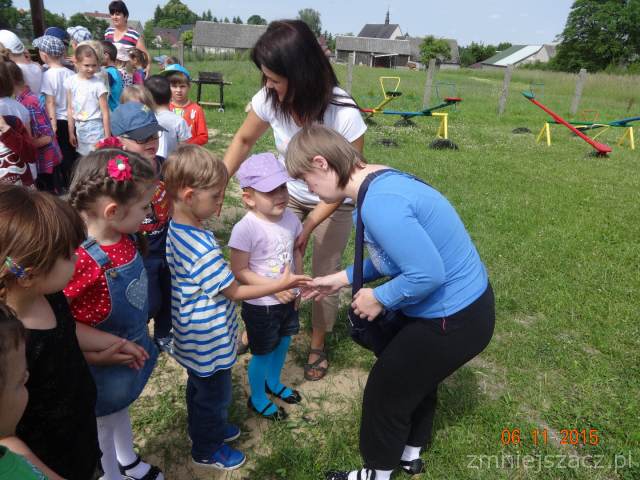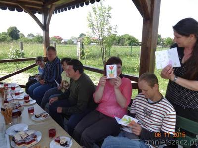 W związku z powyższym rozpoczęliśmy współpracę z Tomaszem B. Kierownikiem Warsztatów Terapii Zajęciowej w Ostrowie i Jego podopiecznymi. Było to już drugie integracyjne spotkanie. Mimo,że podopieczni pana Tomasza nie są małymi dziećmi to Nasze przedszkolaki fantastycznie włączyły  się  we wspólne zabawy i konkurencje nie reagując na ich niepełnosprawność.Wspólna gościna jeszcze bardziej zacieśniła więź, czego dowodem były pożegnania na zakończenie spotkania.Nie należy chronić dzieci przed obcowaniem z ludźmi niepełnosprawnymi, bo coraz częściej spotykamy  dzieci-osoby dorosłe niepełnosprawne, a przecież "niepełnosprawnym być nie znaczy być gorszym."