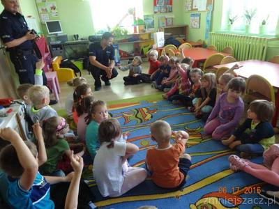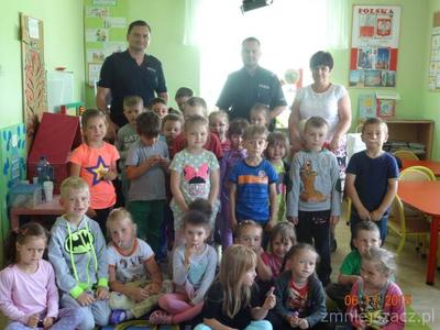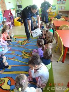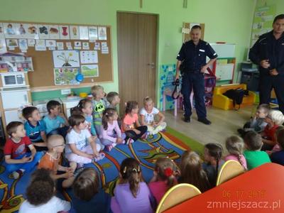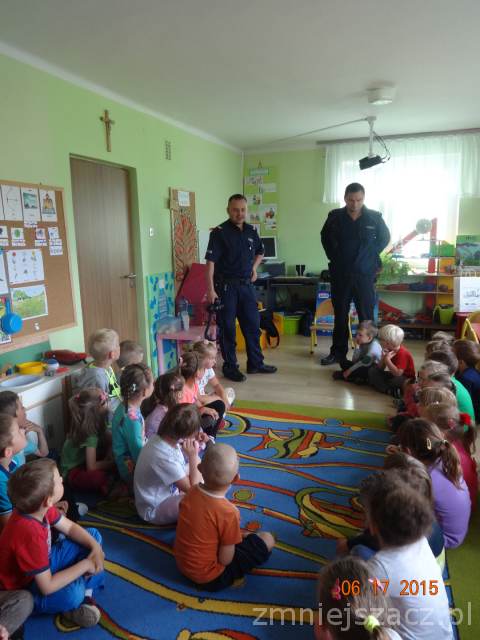 Wakacje już wkrótce, czas zabawy i wypoczynku warto więc pomyśleć o bezpieczeństwie. Z tej okazji zaprosiliśmy do przedszkola policjantów z Posterunku Policji w Małogoszczu. Dzieci bardzo serdecznie powitały gości i słuchały tego, co mówili.Starszy sierżant Przemysław Łaskawiec przypomniał dzieciom zasady bezpiecznego poruszania się po drodze, numery alarmowe oraz zasady ograniczonego zaufania w stosunku do obcych i korzystania z akwenów wodnych pod opieką  osób dorosłych. Na zakończenie spotkania dzieci otrzymały od dzielnicowego Marka Żarskiego słodkie upominki.