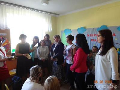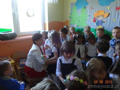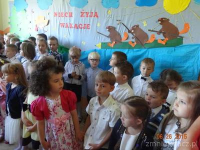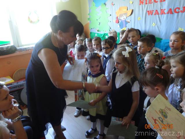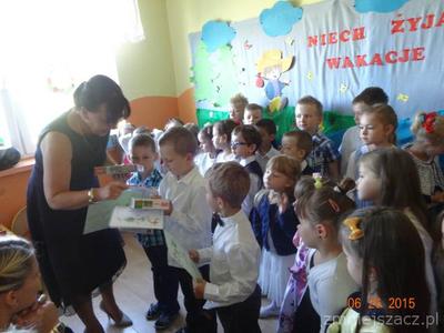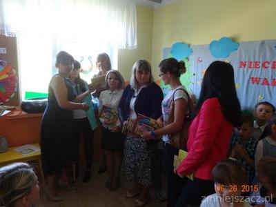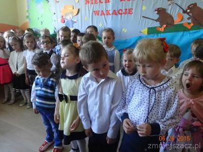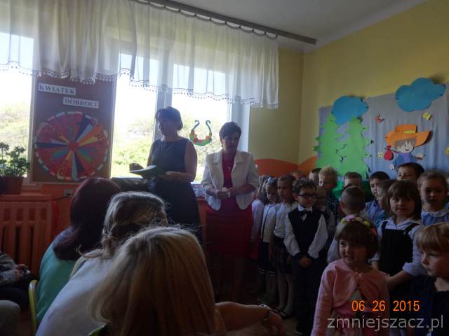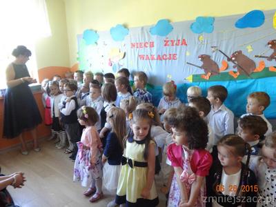 Dnia 26 czerwca odbyła się uroczystośc z okazji zakończenia roku szkolnego. Uroczystośc rozpoczęła Pani Dyrektor Wanda Bodzioch witając przybyłe dzieci i rodziców.Dzieci przedstawiły krótka część artystyczną.Grupa starsza pożegnała panie i przedszkole.Grupa młodsza pożegnała starszaków życząc im, aby jak najlepiej się uczyły w szkole oraz wszelkiej pomyślności na nowej drodze obowiązków szkolnych .Na pamiątkę uczęszczania do przedszkola dzieci otrzymały dyplomy, książki oraz słodkie upominki.W roku szkolnym 2014/2015 dzieci uczestniczyły w zbiórce makulatury,baterii i puszek. I tak w kategorii makulatury