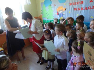 Pani Dyrektor gorąco podziękowała rodzicom za całoroczną współpracę, a szczególnie Radzie Rodziców, która otrzymała dyplomy i słodkie upominki.Życzenia otrzymały również dzieci. Na zakończenie uroczystości dzieci zaśpiewały piosenkę ,,Niech żyją wakację”