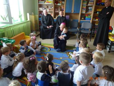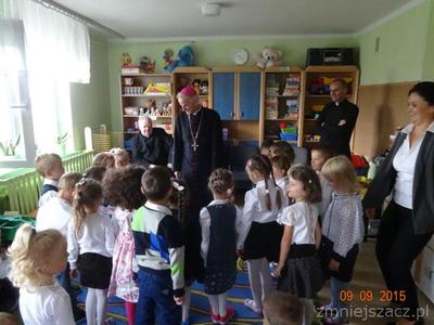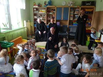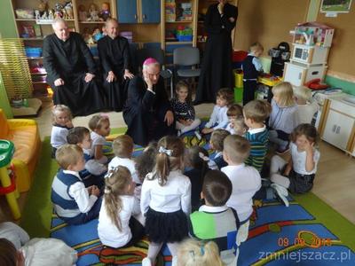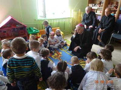 Ksiądz Biskup Marian Florczyk w ramach wizytacji parafii odwiedził nasze przedszkole w dniu 9 września. Ksiądz Biskup nawiązał znakomity kontakt z przedszkolakami. Dzieci zaśpiewały piosenkę "Taki duży taki mały”. Tak piękne i wzruszające spotkanie na długo pozostanie w Naszej pamięci.