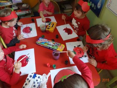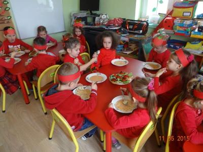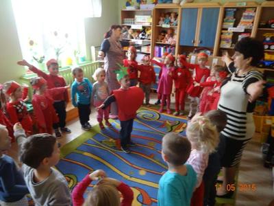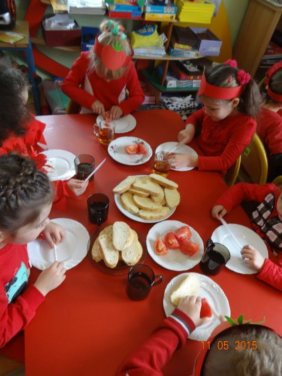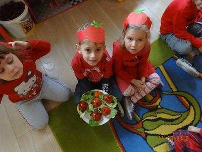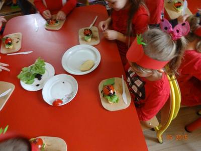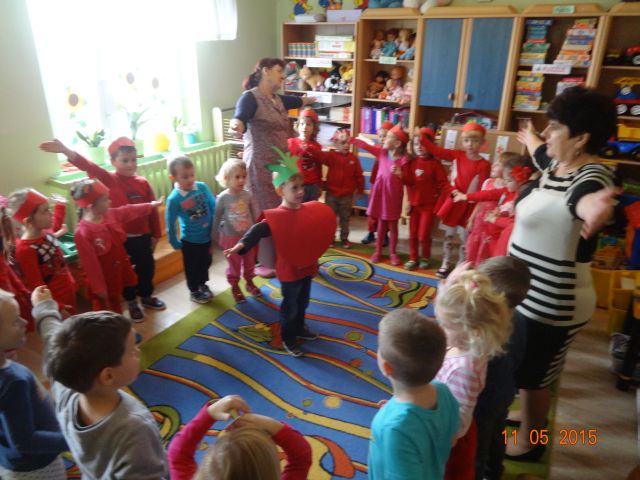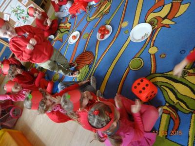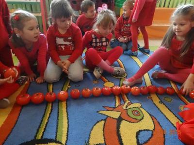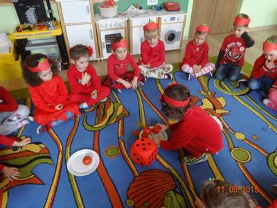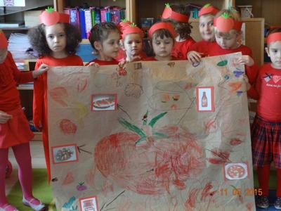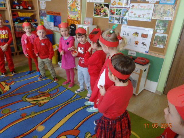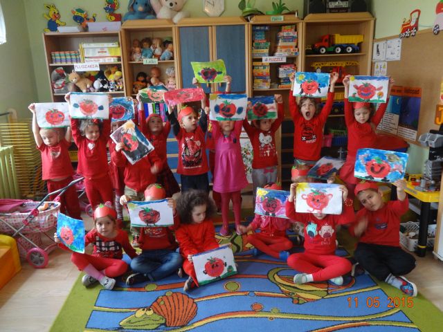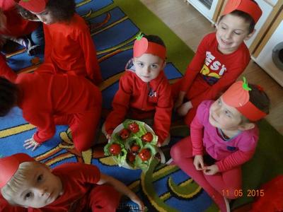 Dnia 05.11.2015 r.  w grupie ,,Biedronki” obchodzony był ,,Dzień pomidora”, aby było wyjątkowo wszyscy włożyli ubrania w tym kolorze. Bohaterem dnia był oczywiście śliczny, smaczny czerwony POMIDOREK . Zaraz po śniadaniu, na którym królował oczywiście pomidor odbyła się inscenizacja wiersza pt.: „Pomidor” Jana Brzechwy w wykonaniu pięciolatków, na które została także zaproszona grupa młodsza. A potem była wspaniała zabawa, dzieci bawiły się przy piosence „Pomidorek”, ,,Witaminki” rozpoznawały za pomocą zmysłów  pomidora, uczestniczyły w zabawach ruchowych  ,,Pomidor w tunelu”, ,,Pomidor do garnka” itp . Wykonały plakat ,,Co można zrobić z pomidora? „ Dowiedziały się  jakie witaminy w sobie zawiera to czerwone warzywo. Poznały budowę rośliny pomidora. Po zabawie przedszkolaki przeszły do czynów: porządnie umyły ręce i samodzielnie wykonywały pomidorowe biedronki. Po pracy nastąpiła degustacja, smakowało wyśmienicie, nawet tym, którzy stronią od warzyw. W dalszej części dnia przedszkolaki wykonały pracę plastyczną pod hasłem „Stworek pomidorek”. A na obiad była oczywiście zupa pomidorowa. Dzień był bardzo ciekawy, wesoły i pouczający.