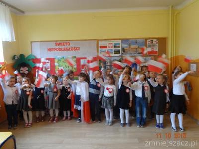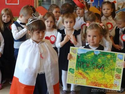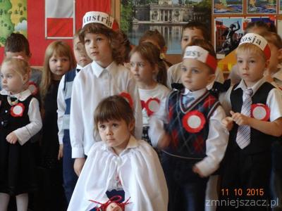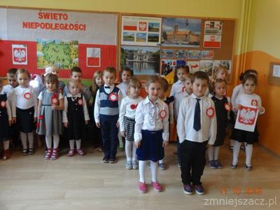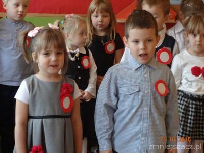 W dniu 10 listopada w naszym przedszkolu obchodziliśmy Narodowe Święto Niepodległości. Dzieci tego dnia przyszły do przedszkola ubrane na galowo. Słowem i piosenką o treści patriotycznej dzieci oddały szacunek symbolom narodowym , symbolom walki o wolność i zwycięstwo oraz miłość do Ojczyzny. Starszaki przedstawiły scenkę obrazującą historie naszego kraju.Poprzez kultywowanie uroczystości narodowych przedszkolaki uczą się patriotyzmu, kształtują pozytywne postawy i uczucia patriotyczne. Było uroczyście biało-czerwono i bardzo patriotycznie.