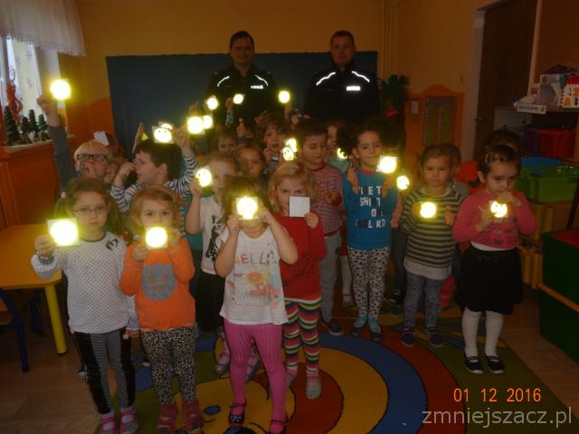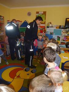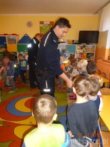Tuż przed feriami zimowymi zostało zorganizowane spotkanie z policjantami. W pogadance na temat :,,Bezpieczne ferie"udział wzięli policjanci z Komisariatu Policji w Małogoszczu st. sierż.M Żarski i sierż. J. Wójcik. Przedszkolaki chętnie odpowiadały na pytania jak bezpiecznie bawić się podczas zimowych ferii, słuchały rad i przestróg.Na koniec spotkania dzieci otrzymały lizaki i odblaski. W podziękowaniu dzieci zaśpiewały piosenkę ,,Nie otwieraj drzwi”.