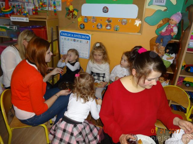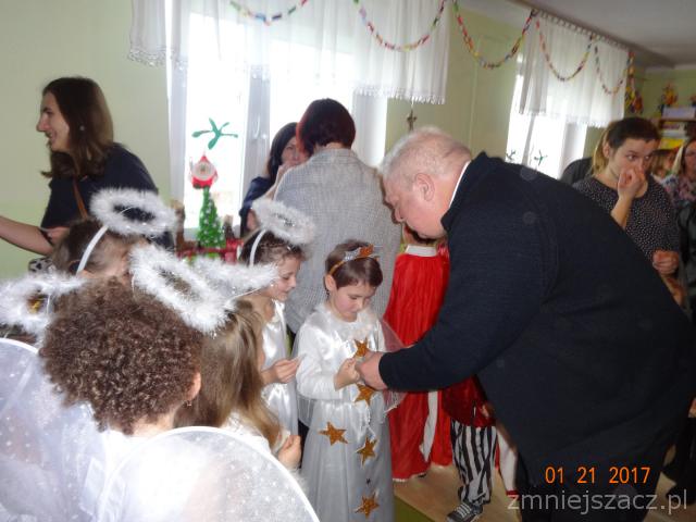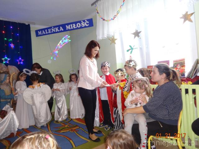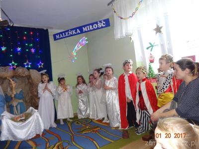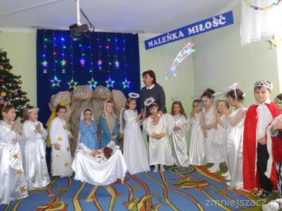 20 grudnia(wtorek) odbyły się Jasełka w wykonaniu grupy starszej. W tym uroczystym dniu gościliśmy ks . proboszcza naszej parafii  J.Koronę oraz ks.wikariusza I. Tuora oraz rodziców. Gości gorąco przywitała pani dyrektor W. Bodzioch. Następnie dzieci przedstawiły tradycyjne Jasełka. W rolach głównych oczywiście Święta  Rodzina, Aniołki, Królowie, Pasterze  oraz Gwiazdki. Piękne występy i kolędy poruszyły nie jedno serce .Wspaniały występ przedszkolaków został nagrodzony gromkimi brawami. Po przedstawieniu pani dyrektor złożyła wszystkim życzenia świąteczne. Ks.proboszcz podziękował przedszkolakom za piękne występy wręczając torbę ze słodyczami na ręce pani dyrektor. Jak obyczaj nakazuje również w naszym przedszkolu podzieliliśmy się opłatkiem. Następnie wszyscy zasiedli przy pięknie przygotowanym stole wigilijnym, który przygotowali pracownicy przedszkola i rodzice.