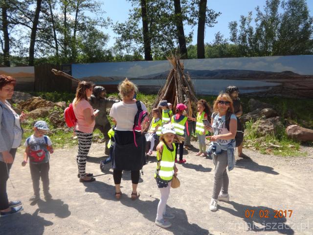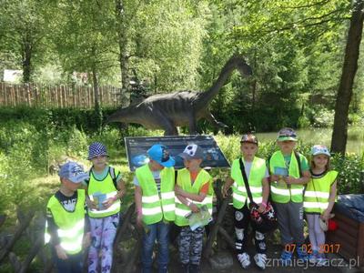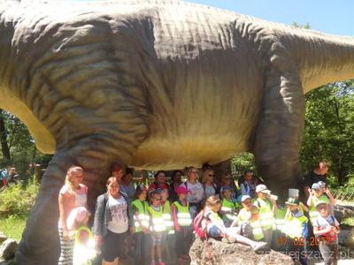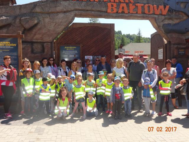 Dnia 1 czerwca przedszkolaki wraz z rodzicami ,panią dyrektor i nauczycielami wyruszyły na jednodniową wycieczkę do PARKU JURAJSKIEGO w BAŁTOWIE. Po szczęśliwym dojechaniu do celu, entuzjazm wśród dzieci wzbudziło zwiedzanie Bałtowskiego Zwierzyńca.W pierwszej części Zwierzyńca odbyli przejażdżkę amerykańskim autobusem (school busem) pomiędzy zwierzętami współcześnie żyjącymi (m.in.: strusie, lamy, wielbłądy, dziki, konie, jelenie i wiele innych gatunków) rozmieszczonymi na wielohektarowym terenie – tzw. Safari. W drugiej części zwiedzający zobaczyli ciekawe gatunki ptactwa i drobnych ssaków, znajdujących się w klatkach Następnie wszyscy udali się do Jura Parku . Przedszkolaki wraz z rodzicami dzielnie maszerowali pośród prehistorycznych gadów .Z kolei w Muzeum Jurajskim dzieci obejrzały różnego rodzaju skamieniałości. Były to kości dinozaurów, szczątki morskich gadów zęby rekinów, koralowce i głowonogi. Największe wrażenie zrobiło Prehistoryczne Oceanarium. Za pomocą technologii trójwymiarowego przekazu przenieśliśmy się w świat podwodnego życia ogromnych gadów. Mieliśmy okazję spotkać się „oko w oko” z gatunkami, które żyły na Ziemi tysiące lat temu. Wrażenie, że są bardzo blisko wywołało u nielicznych strach, jednak większość dzieci była mocno podekscytowana i zafascynowana ich widokiem. Kolejnym punktem wycieczki był ,,Park Rozrywki” w którym dzieci miło wesoło spędziły prawie 3 godziny, były różne atrakcje (basen z kulkami, kolejka ,,Kaczuszki’, karuzela samochodziki, kaczuszki pływające na wodzie itp.Z wycieczki do Krainy Dinozaurów wszyscy wrócili pełni wrażeń i zadowoleni, choć jednak troszkę zmęczeni. Mamy jednak nadzieję, że dla dzieci była to niezapomniana przygoda i mile spędzony czas z rodzicami.