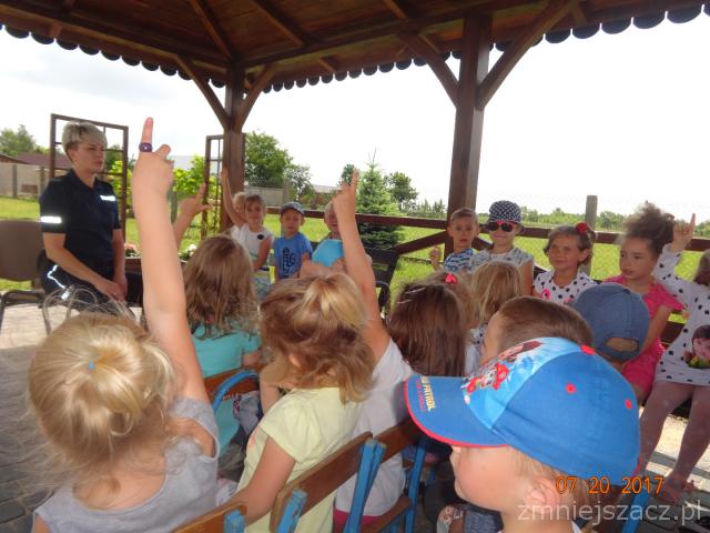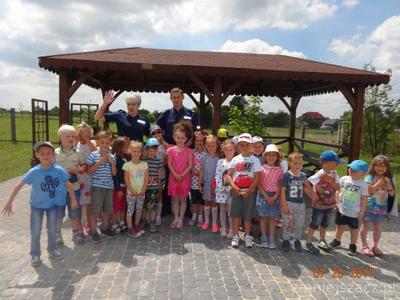 19 czerwca 2017r do przedszkola z wizytą przybyła pani policjantka Katarzyna Pierzchała wraz ze starszym sierżantem Pawłem Blicharskim. Spotkanie przebiegło w bardzo miłej atmosferze. Głównym celem spotkania było przypomnienie podstawowych zasad bezpieczeństwa podczas zabaw  wakacyjnych: