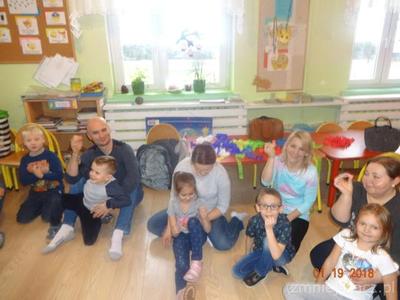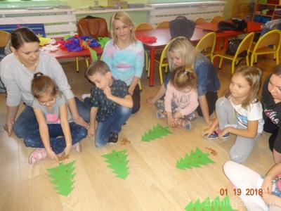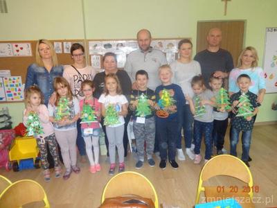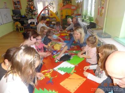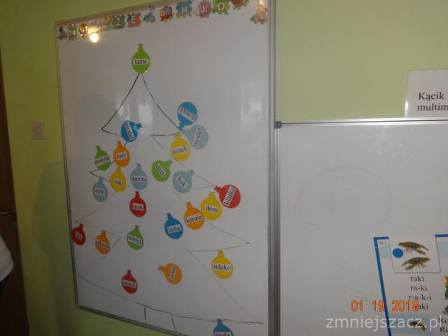 Bardzo lubimy pracować razem z rodzicami. Mieliśmy taką okazję we wtorek 19.12.2017r. Rodzice uczestniczyli z nami w zajęciach otwartych, temat zajęć „Ubieramy choinkę”. Nasza choinka była narysowana na tablicy i zawieszaliśmy na niej bombki na których napisane były wyrazy. Naszym zadaniem było odczytać je, podzielić na głoski lub sylaby i zawiesić na choince według instrukcji naszej pani. Nasi rodzice też zostali przepytani!! Potem rozwiązywaliśmy zadania matematyczne. Zajęcia przeplatane były zabawami ruchowymi. Na koniec wspólnie z rodzicami ozdabialiśmy choinki z kartonu. Używaliśmy do tego brokatu, koralików, cekinów, wstążek, kolorowego papieru i innych przyborów według własnych pomysłów.