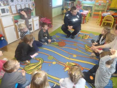 Przed feriami zimowymi 09. 02.2018r. odwiedził nas policjant st. sierż. Paweł Blicharski. Podczas spotkania rozmawialiśmy panem policjantem o zasadach zachowania bezpieczeństwa podczas zbliżających się ferii zimowych. Sanki, narty czy zabawy na śniegu to fajna sprawa , ale czasem dochodzi do nieszczęśliwych wypadków, które często spowodowane są nieostrożnością czy brakiem wyobraźni ze strony dzieci. Nasz gość przestrzegł nas przed takim zachowaniem i udzielił wskazówek jak bezpiecznie bawić się podczas ferii.