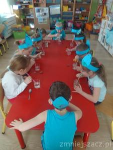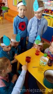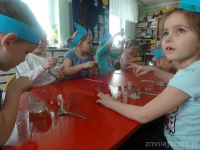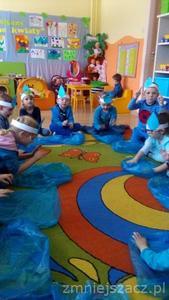 Każdy z nas wie, że woda to życie dla wszystkich organizmów na naszej planecie. Powinniśmy o nią dbać i oszczędzać. 22.03.2018r. obchodziliśmy w przedszkolu Światowy Dzień Wody. Wszystko kręciło się wokół niej. Rano robiliśmy kropelki wody – opasko na głowę, które nosiliśmy cały dzień. Później bawiliśmy się w naukowców: badaliśmy właściwości wody – smak, zapach, kształt. Rozpuszczaliśmy kostki lodu . Sprawdzaliśmy jak zachowuję się sól ,cukier, olej, sok z buraków rozpuszczane w zimnej i ciepłej wodzie. Były zabawy ruchowe przy muzyce. Często piliśmy naszą smaczną i zdrową wodę.