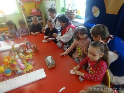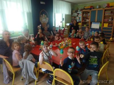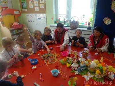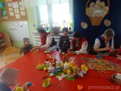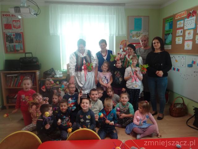 Kolejny wspaniały dzień w naszym przedszkolu. Dzisiaj tj. 26.03.2018r. odwiedziły nas panie z zespołu „Bochenianki”. Atrakcji i wrażeń było co nie miara. Na powitanie pani Pelagia odczytała nam napisany przez siebie wiersz o przedszkolakach, a pani Anna powiedziała wiersz który nauczyła się jeszcze w przedszkolu. Panie zaprezentowały nam swoje rękodzieło: kurki, koszyczki, serwetki, jajka, ubranka dla lalek wszystko robione na szydełku. Kurczaczki i koguciki z bibuły i jajka wspaniale ozdobione kolorową bibułą i cekinami. Wszystko było piękne i precyzyjnie wykonane. Potem każdy z nas ozdabiał swoje jajko a panie chętnie nam w tym pomagały. Kiedy jajka były już gotowe otrzymaliśmy kurki które wykonała dla nas na szydełku pani Danuta. Musieliśmy wypchać je watą aby nabrały kształtów. Panie „Bochenianki” zaśpiewały również dla nas piosenki ze swojego repertuaru. W podziękowaniu za tak wspaniały dzień każda grupa zaśpiewała naszym gościom piosenkę. Wszyscy wspaniale się bawili i dużo nauczyli.