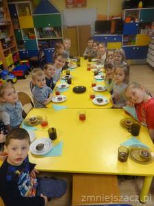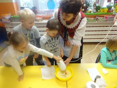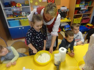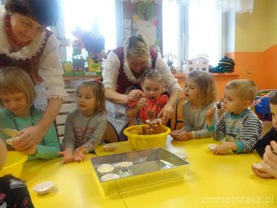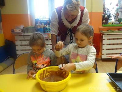 Wszyscy lubimy słodycze, a szczególnie dzieci. We wtorek 27.03.2018r. razem z paniami z Kołem Gospodyń Wiejskich z Kozłowa piekliśmy świąteczne babeczki. Najpierw wymieszaliśmy wszystkie składniki na jednolitą masę. Potem panie z koła podzieliły ciasto na dwie części. Do jednej dodaliśmy cukier wanilinowy, a do drugiej kakao. Każdy z nas nałożył ciasto do swojej foremki. Z niecierpliwością czekaliśmy kiedy babeczki się upieką. Po 20 minutach udekorowaliśmy nasze wypieki czekoladą i kolorowymi cukiereczkami. Wreszcie nastąpił najlepszy moment dnia. Z apetytem zjedliśmy własnoręcznie upieczone babeczki.