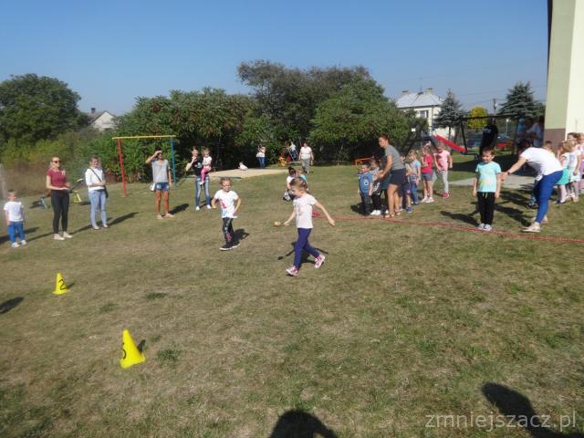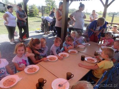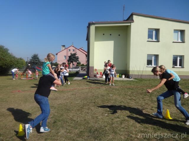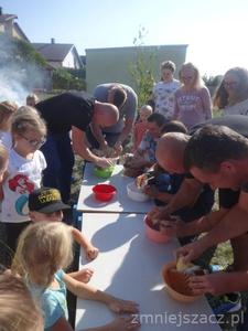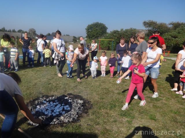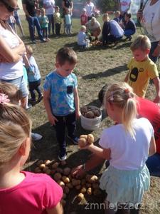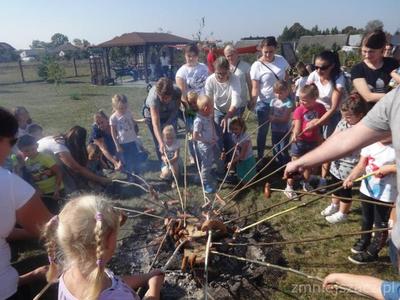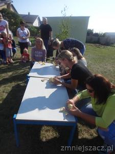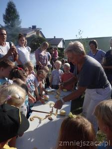 Święto Pieczonego Ziemniaka w naszym przedszkolu to już tradycja. Wzorem ubiegłych lat zaprosiliśmy rodziców do świętowania razem z nami. Rozpoczęliśmy od wrzucenia do ogniska ziemniaków. W oczekiwaniu na smakołyki z ogniska czas umilały nam różne zabawy i rozgrywki sportowe z ziemniakiem w roli głównej. Urządziliśmy wykopki z podziałem na grupy. Nasze mamusie skrobały ziemniaka, żeby powstała najdłuższa obierka. Tatusiowie musieli utrzeć ciasto na placki ziemniaczane. Starszaki niosły ziemniaka na łyżce, a maluchy wrzucały ziemniakami do celu. Rodzice skakali w workach i nosili dzieci na plecach. Po tak dużym wysiłku przyszedł czas na poczęstunek. Zjedliśmy pieczone kiełbaski, ziemniaki z ogniska i obiad na dworze.