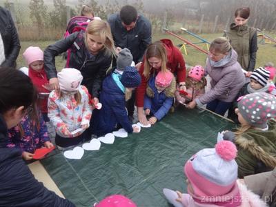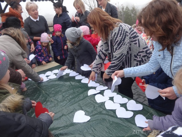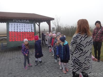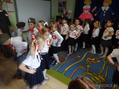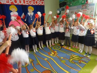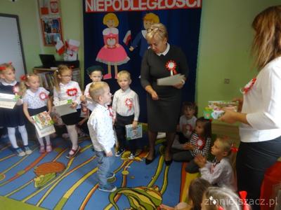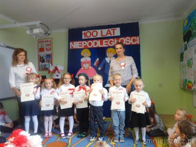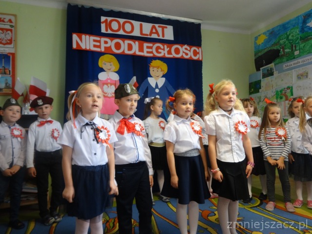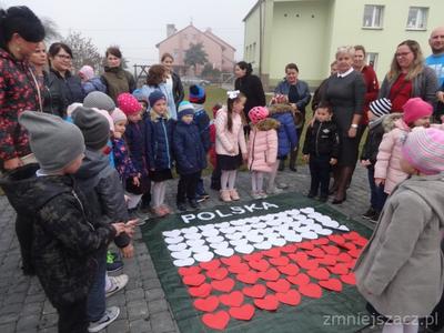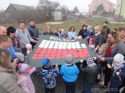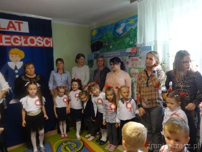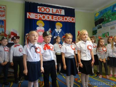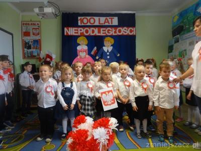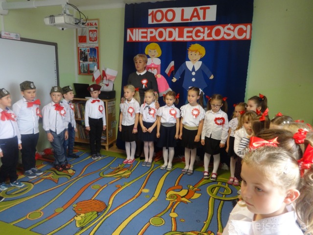 Od najmłodszych lat uczymy się szacunku do Ojczyzny, symboli narodowych i najbliższej okolicy. Chcąc to okazać 09.11.2018r. przedstawiliśmy program artystyczny z okazji Święta Niepodległości na który zaprosiliśmy rodziców starszaków. Pani dyrektor Wanda Bodzioch rozpoczęła uroczystość witając wszystkich gości, powiedziała kilka słów o naszej wolności. Nasz występ zaczęliśmy od poloneza. Były wiersze patriotyczne, piosenki i taniec z pomponami. Ogłoszone zostały również wyniki konkursu plastycznego „Moja mała ojczyzna”. O godzinie 11.11 wspólnie z rodzicami odśpiewaliśmy Hymn Narodowy, a potem na placu przedszkolnym wspólnie wykonaliśmy flagę ze 100 białych i czerwonych serc.