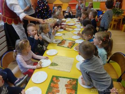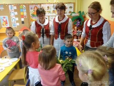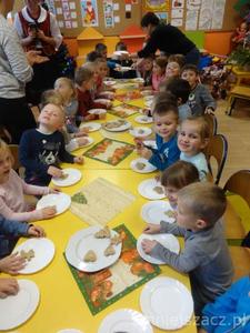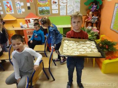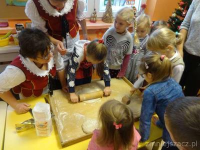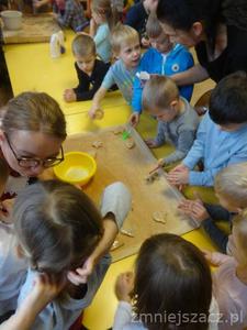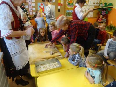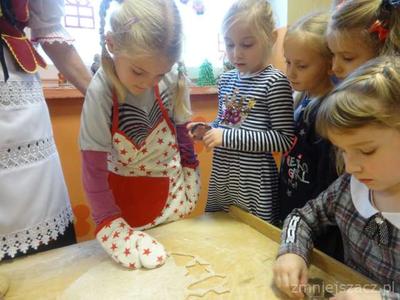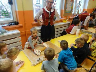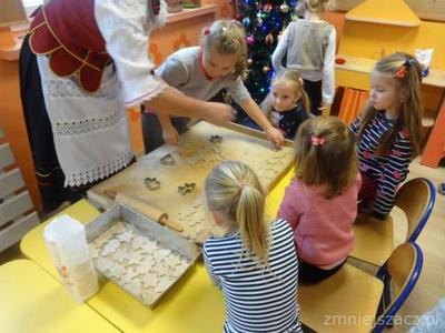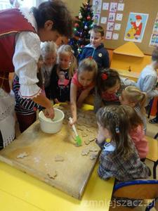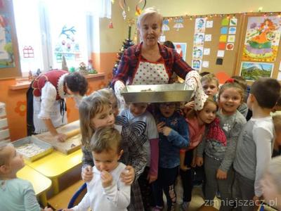 Tradycją naszego przedszkola stało się pieczenie pierniczków z Kołem Gospodyń Wiejskich z Kozłowa. W tym roku panie również przyjęły nasze zaproszenie. Zabawa była przednia. Najpierw wszyscy liczyliśmy składniki z których będą pierniczki. Potem ciężka praca – zagniatanie i wałkowanie ciasta. Następnie lekko i przyjemnie – wycinanie kształtów i układanie na blaszkę. Każdy wziął swój ulubiony kształt były: gwiazdki, choinki, dzwoneczki, serca, bałwanki. Jednak najtrudniejszy był moment kiedy całe przedszkole pachniało upieczonymi pierniczkami, a my musieliśmy poczekać aż wystygną. Opłacało się, bo na koniec mogliśmy je polukrować i zjeść ze smakiem. Zjedliśmy wszystkie, nic nie zostało.