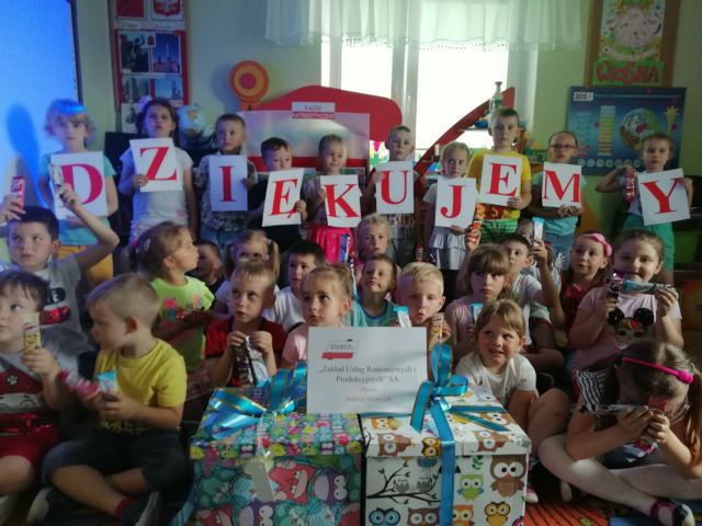 Dyrektor, nauczyciele i dzieci z Przedszkola Publicznego w Kozłowie dziękują panu Andrzejowi Adamczykowi prezesowi Zakładu Usług Remontowych i Produkcyjnych S.A. w Małogoszczu za słodkości podarowane przedszkolakom z okazji Dnia Dziecka.