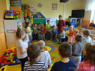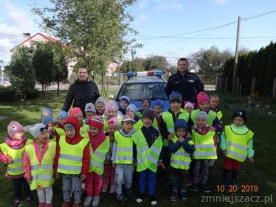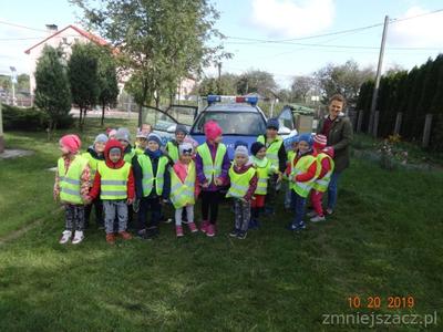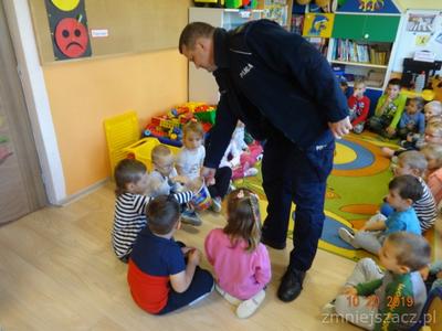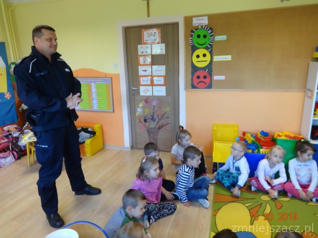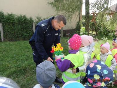 19 września 2019r. w naszym przedszkolu był pan policjantem sierż. szt. Paweł Mara z Komisariatu Policji w Małogoszczu. Rozmawialiśmy z panem policjantem o zasadach ruchu drogowego oraz przypomnieliśmy zagadnienia dotyczące naszego bezpieczeństwa w przedszkolu i w domu. Dowiedzieliśmy się również, jak należy zachować się w kontaktach z obcymi ludźmi, jak dbać o bezpieczeństwo własne i innych oraz do kogo zwracać się o pomoc w sytuacji zagrożenia. Z dużym zainteresowaniem słuchaliśmy rad i wskazówek zaproszonego gościa. Tym bardziej, że koniec pogadanki poczęstował nas pysznymi lizakami. Jednak to nie była ostatnia niespodzianka. Mogliśmy jeszcze wsiąść do policyjnego samochodu i włączyć syrenę. Na zakończenie wizyty w podziękowaniu wręczyliśmy panu policjantowi bukiet kwiatów.
