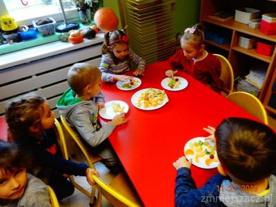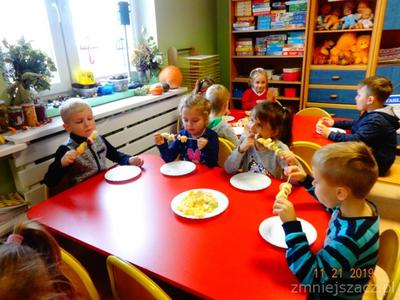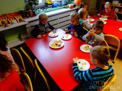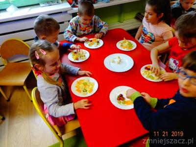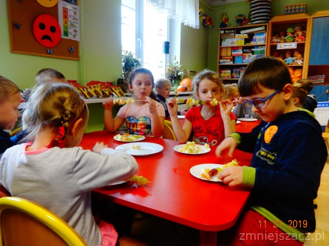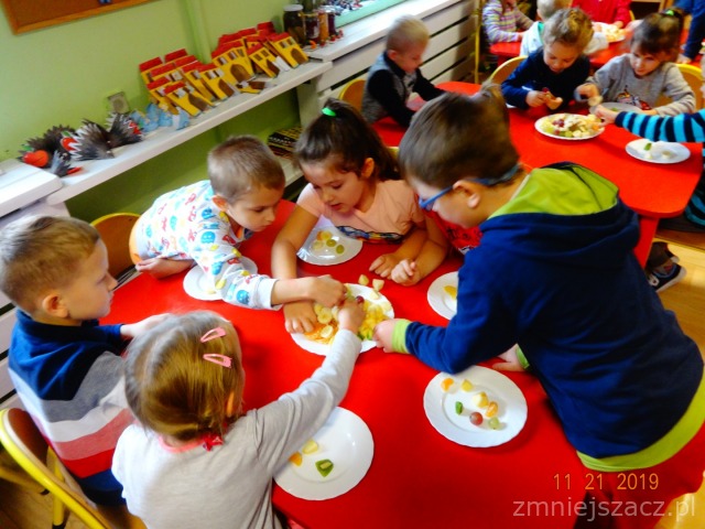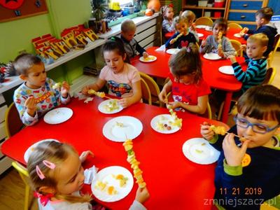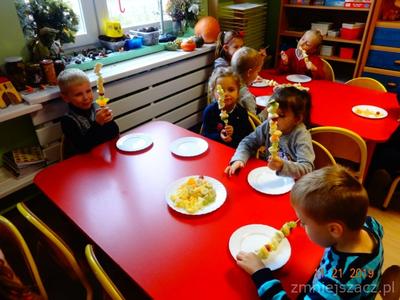 „Przedszkolak bezpieczny i zdrowy, dlatego zawsze wesoły” i dlatego my „Krasnoludki” 21.11.2019r. robiliśmy zdrowe owocowe szaszłyki. Na talerzach mieliśmy pokrojone owoce i nabijaliśmy je na wykałaczkę według uznania. A potem był najprzyjemniejszy moment – degustacja. Smaczne, soczyste, a przede wszystkim zdrowe owoce trafiły do naszych brzuszków.