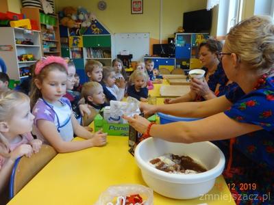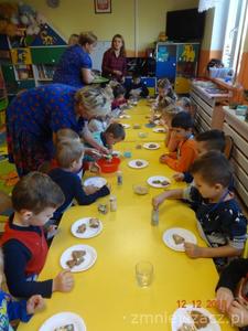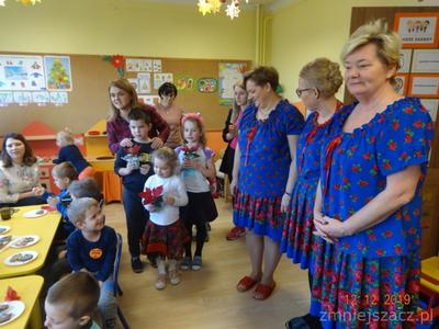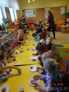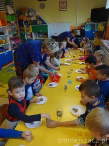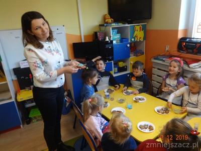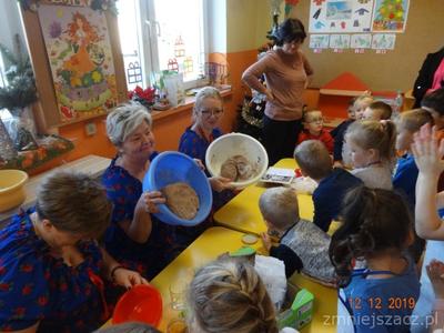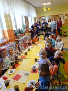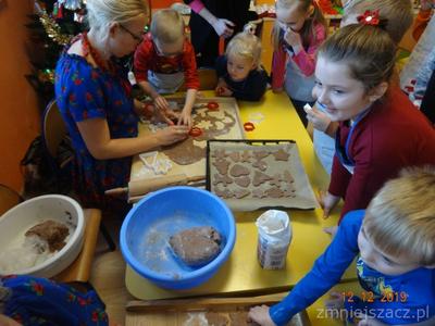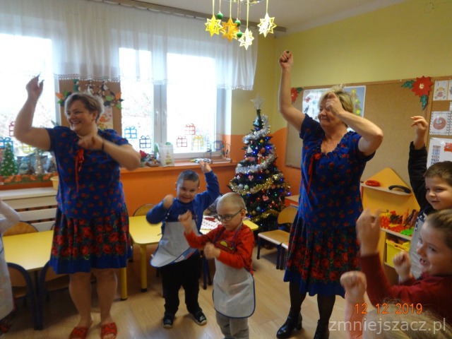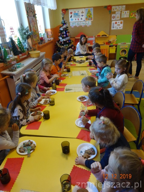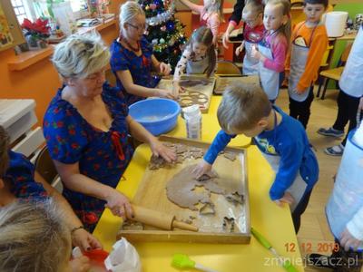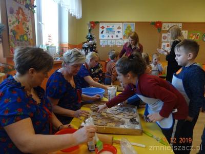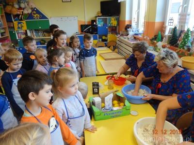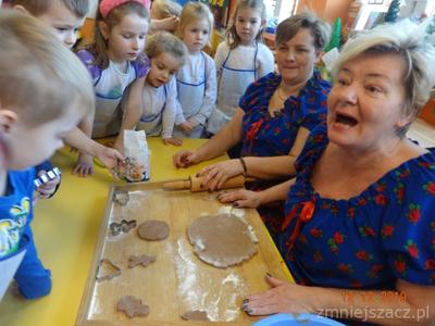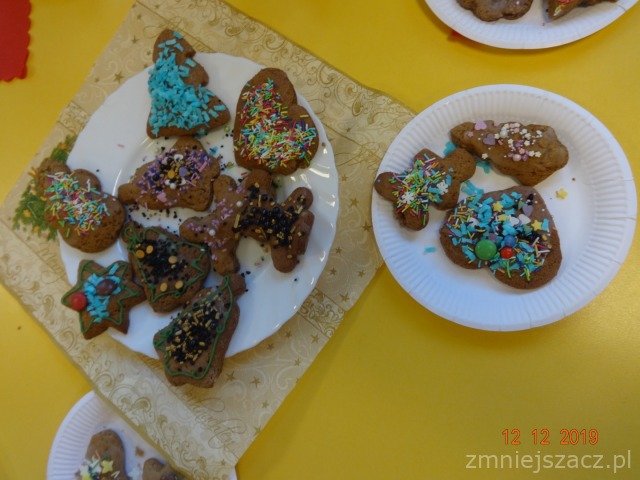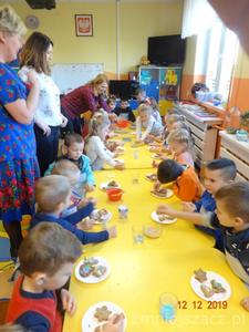 W tym roku dołączyliśmy do akcji „Razem na Święta”, organizowanej przez Ministerstwo Edukacji Narodowej. 12.12.2019r. piekliśmy pierniczki z paniami z Koła Gospodyń Wiejskich w Kozłowie. Liczyliśmy składniki na pierniczki, wąchaliśmy przyprawy korzenne i śpiewaliśmy dla naszych gości kolędy. Kiedy panie zagniotły ciasto, zaczęliśmy wycinać gwiazdki, dzwoneczki, bałwanki, choinki i ludziki. Gdy pierniczki się piekły zapach rozchodził się po całym przedszkolu. Potem nastąpiło długo wyczekiwane dekorowanie i degustowanie. Pierniki były przepyszne.