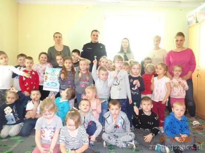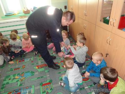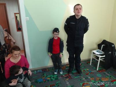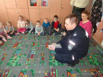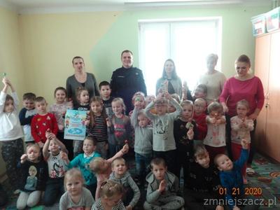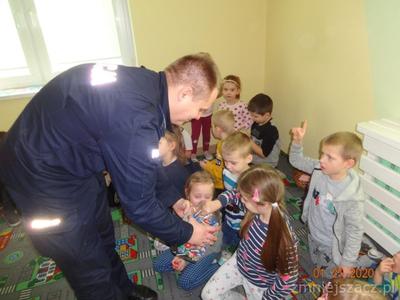 Ferie zimowe to czas zabaw i szaleństw na śniegu. W trosce o nasze bezpieczeństwo 21 lutego 2020 przybył do przedszkola zaproszony gość z Komisariatu Policji w Jędrzejowie. Pan policjant przypomniał nam jak bezpiecznie bawić się na śniegu. Przestrzegł nas o przykrych skutkach wchodzenia na kruchy lód i zjeżdżania na sankach w pobliżu jezdni. Przypomniał zasady bezpiecznego przechodzenia przez drogę. Wszyscy chętnie braliśmy udział w rozmowie a na koniec dostaliśmy od pana policjanta po lizaku.