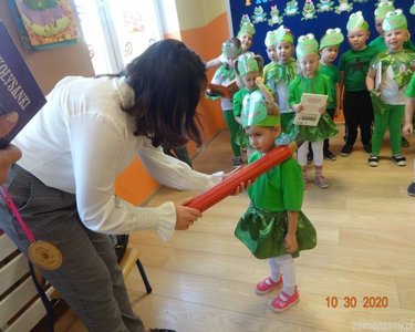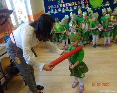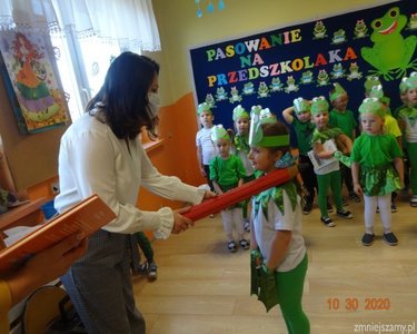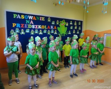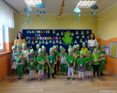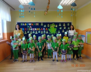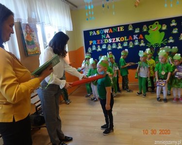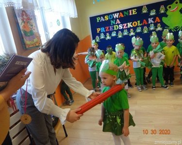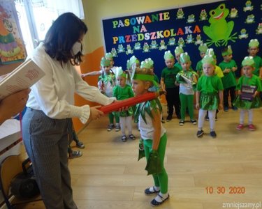 30 października 2020r. odbyła się w naszym przedszkolu uroczystość Pasowania na Przedszkolaka. Bohaterami tego dnia były dzieci z grupy  „Żabki”, które zaprezentowały program artystyczny. Pięknie recytowały wierze, śpiewały, tańczyły i ćwiczyły. Po występach pani dyrektor Ilona Słupczyńska pasowała każdego na przedszkolaka, kładąc ołówek na ramieniu. Na pamiątkę tego dnia wszyscy otrzymali  medale, książki i coś na słodko.