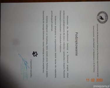 Zakończyliśmy akcję zbierania karmy i starych koców dla bezdomnych zwierząt ze schroniska w Dyminach. Otrzymaliśmy podziękowania za zbiórkę.