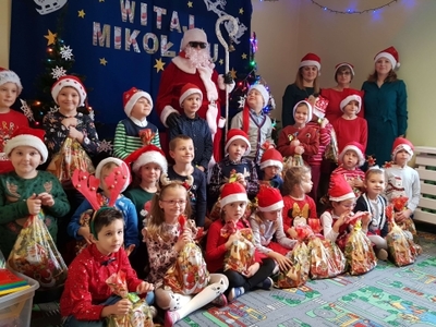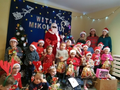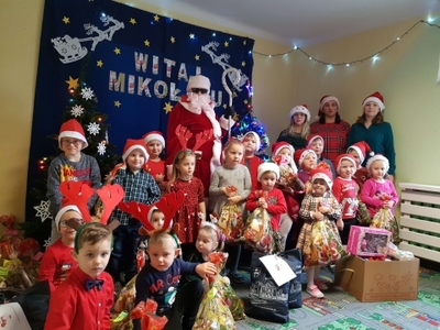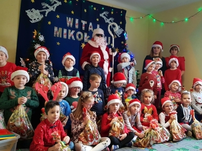 Przedszkolaki przez cały rok czekały na specjalnego gościa. Dnia 4 grudnia 2020r. odwiedził nas Św. Mikołaj. Najpierw przeszedł się po placu, a dzieci obserwowały go przez okna. Potem zapukał do drzwi przedszkola. Dzieci powitały go wierszem i piosenką. Zostały obdarowane prezentami nie tylko przez Św. Mikołaja, ale też przez Burmistrza Miasta i Gminy Małogoszcz pana Mariusza Piotrowskiego. Każda grupa otrzymała nowe zabawki na swoją salę. Nie obyło się bez pamiątkowych zdjęć. Rodzice jak zwykle stanęli na wysokości zadania – pomogli Mikołajowi przygotować prezenty. Teraz czekamy na prezenty pod choinką.