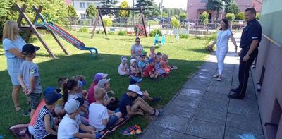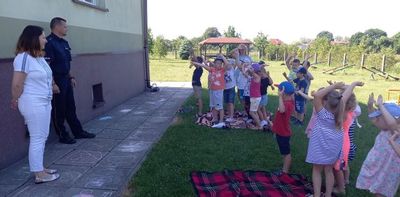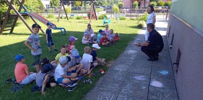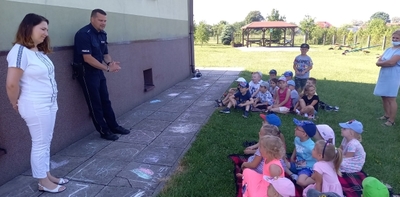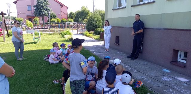 Wielkimi krokami zbliżają się upragnione przez dzieci wakacje. Dlatego w piątek 18 czerwca odwiedził nas pan policjant mł. asp. Paweł Mara udzielając przedszkolakom cennych rad na wakacje. Po tym spotkaniu dzieci wiedzą: którą stroną drogi trzeba chodzić, jak zachować się gdy zaczepia nas obca osoba, jak zachować się gdy do domu zapuka nieznajomy, co zrobić gdy spotkamy groźnego psa, co zrobić gdy zgubimy się na wakacjach. Wszystkie rady przedszkolaki wzięły sobie do serca i będą ich sumiennie przestrzegać podczas wakacji.