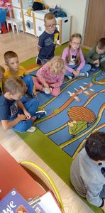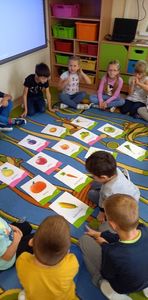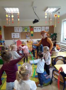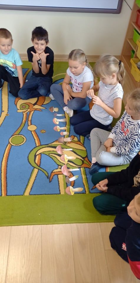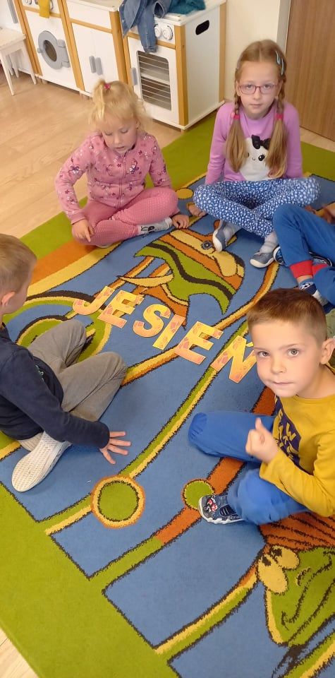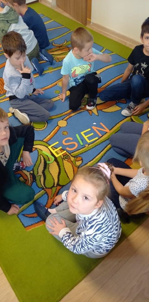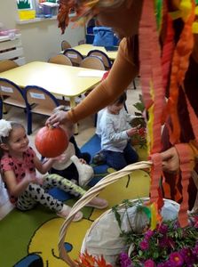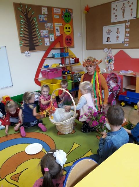 Już zawitała do nas jesień. Żabki  powitały ją 23.09.2021, a  Słoneczka 24.09.2021 podczas zabaw i quizów. Celem zabaw było utrwalenie wiadomości o jesieni, integrowanie się dzieci, a przede wszystkim wspaniała zabawa. Pani Jesień, która zaczęła swoje panowanie weszła z wielkim koszem pełnym darów: jabłek, orzechów, kasztanów, żołędzi, grzybów i zaczęła przedstawiać jesienny świat. Dzieci poznawały dary jesieni, rozwiązywały zagadki, odpowiadały na pytania w „Jesiennym quizie”, liczyły grzyby, układały napis jesień. Zabawom towarzyszyły jesienne piosenki.  Na koniec zajęć wykonane zostały  piękne prace plastyczne.