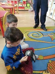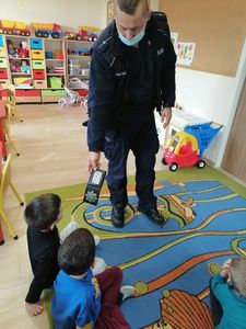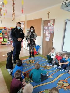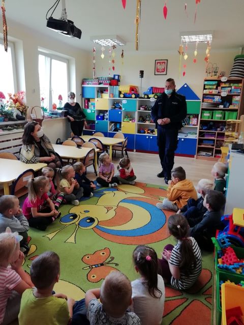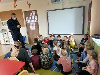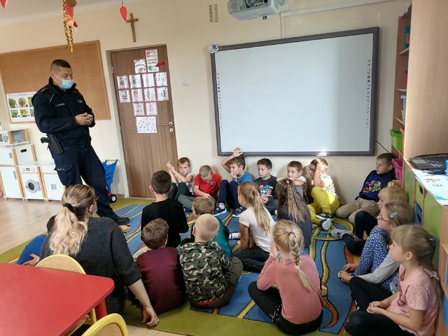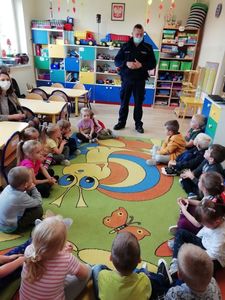 07 października 2021r. w naszym przedszkolu odbyło się spotkanie z panem policjantem . Tematem spotkania było utrwalenie z dziećmi zasad ruchu drogowego oraz zasad dotyczących bezpieczeństwa dzieci w przedszkolu i w domu. Pan policjant przypomniał jak zachować się podczas przechodzenia przez jezdnię. Wytłumaczył jak należy zachować się w kontaktach z obcymi ludźmi, jak dbać o bezpieczeństwo własne i innych oraz do kogo zwracać się o pomoc w sytuacji zagrożenia. Dzieci z dużym zainteresowaniem słuchały rad i wskazówek zaproszonego gościa.