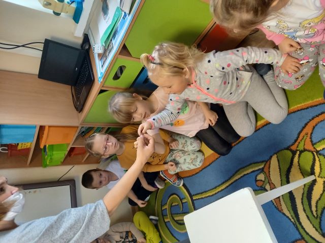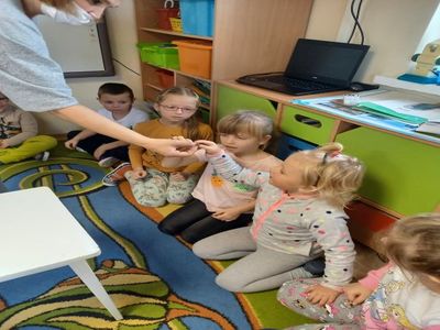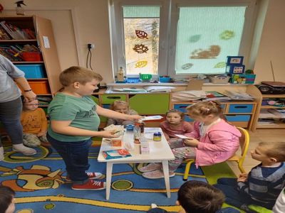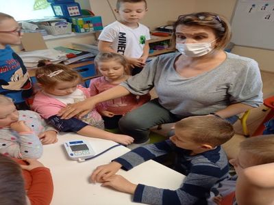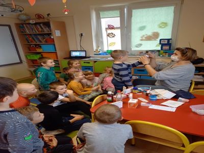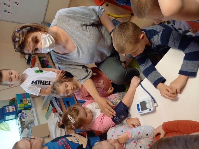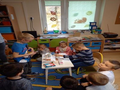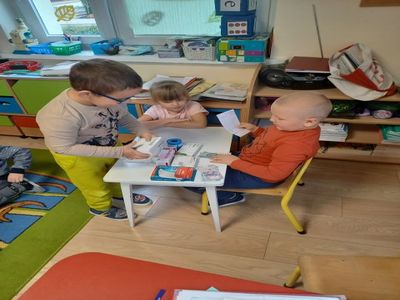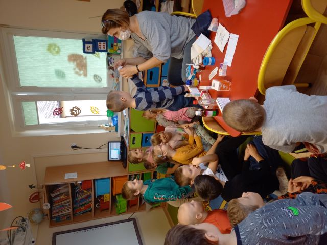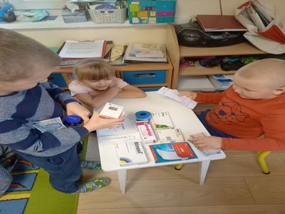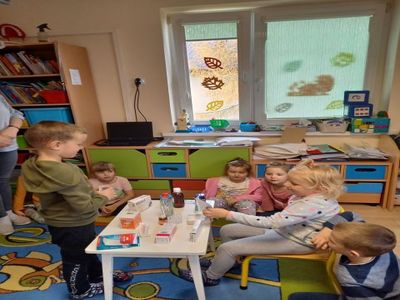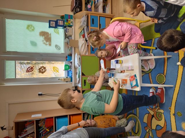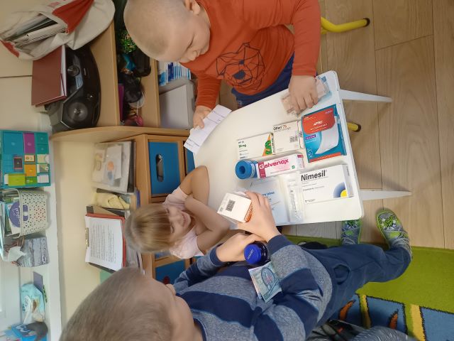 Dzisiaj przedszkolaki poznawały zawód farmaceuty. Dowiedziały się że, farmaceuta realizuje  recepty, sprzedaje produkty medyczne i leki gotowe. Wytwarza leki recepturowe, udziela porad w zakresie stosowania i działania leków.  Jednak najlepsza była zabawa w farmaceutę, która trwała do późnego popołudnia.