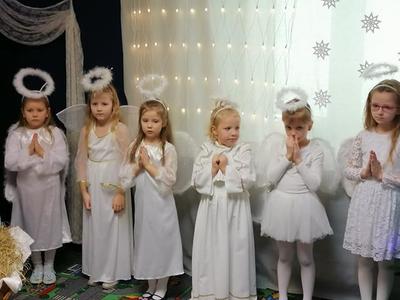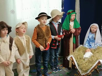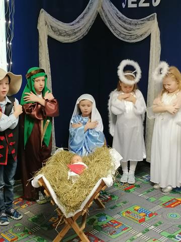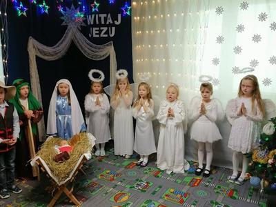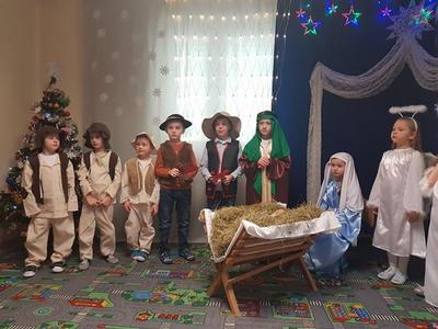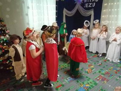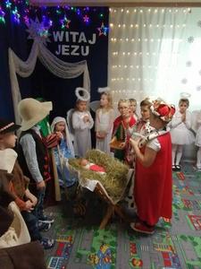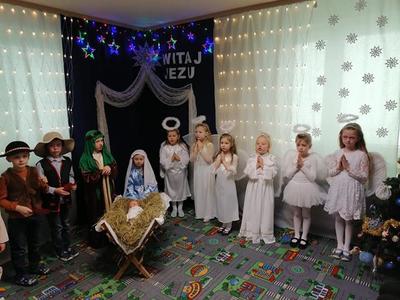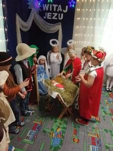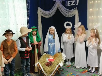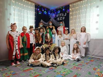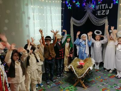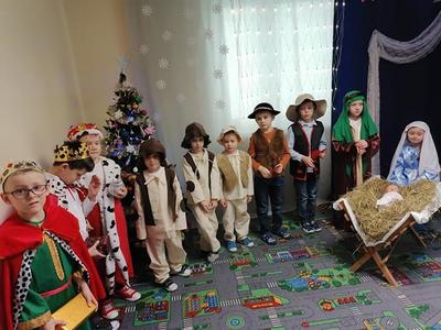 Okres poprzedzający  Święta Bożego Narodzenia był dla przedszkolaków z grupy Żabki bardzo pracowity. Dzieci z wielkim zaangażowaniem i zapałem przygotowywały jasełka. 22.12.2021  przedszkolaki przedstawiły historię  narodzin Jezusa. Piękna dekoracja nawiązująca do Betlejem oraz stroje przedszkolaków były dopełnieniem całego przedstawienia i wprawiły wszystkich świąteczny nastrój.   Mali artyści wygłaszali swoje role, śpiewali kolędy i pastorałki. Po występie zostali nagrodzeni gromkimi brawami.