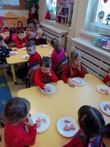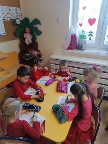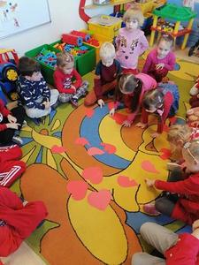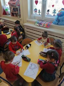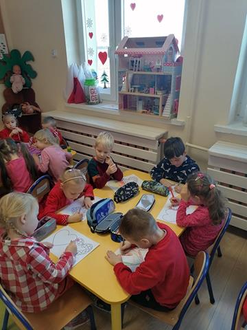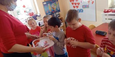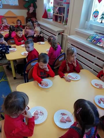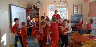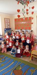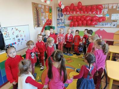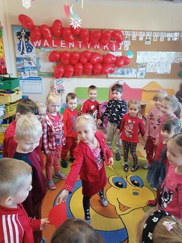 W dniu św. Walentego w naszym  przedszkolu królował kolor czerwony. Przedszkolaki zapoznały się z tradycją Walentynek  oraz patronem dnia zakochanych. Dzieci dowiedziały się jak ważne jest okazywanie uczuć  i emocji kolegom, koleżankom i najbliższej rodzinie. Nie zabrakło  zabaw  tanecznych  przy piosenkach o miłości. Dzieci wykonały też kartki walentynkowe dla swoich  bliskich. A na koniec zjadły słodkie ciasteczka w kształcie serduszek.