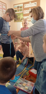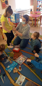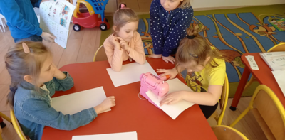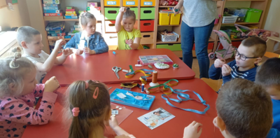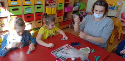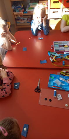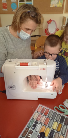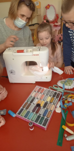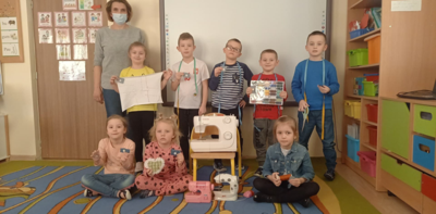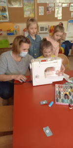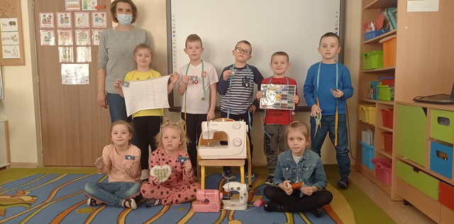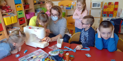 W piątek 11.03.2022 w ramach projektu edukacyjnego „Poznajemy zawody”, przedszkolaki z grupy "Żabki" poznały pracę krawcowej. W czasie zajęć miały możliwość zapoznania się z akcesoriami potrzebnymi do szycia, poznania różnych rodzajów materiałów. Dzieci pobierały sobie miarę, nawlekały nitkę na igłę i przyszywały guziki. Szymon stwierdził, że to jest trudne i on nie zostanie krawcem. Natomiast dziewczynki były zachwycone możliwością szycia na maszynie.
