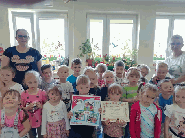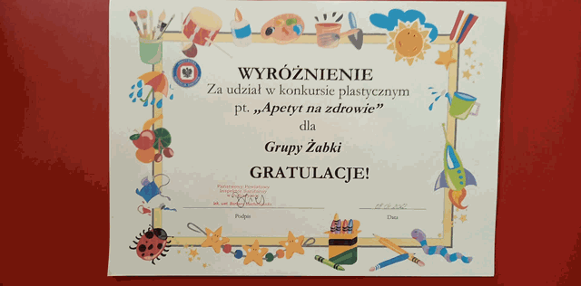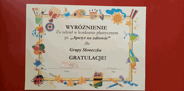Przedszkolaki brały udział w konkursie plastycznym  pt.  „Apetyt na zdrowie” ogłoszonym przez Państwowego Powiatowego  Inspektora Sanitarnego w Jędrzejowie. Celem konkursu było propagowanie nawyków związanych z prawidłowym odżywianiem poprzez informacje nt.  wartości  odżywczych  spożywanych posiłków, źródeł  witamin  niezbędnych do prawidłowego rozwoju i zdrowia. Obie grupy otrzyma wyróżnienie.