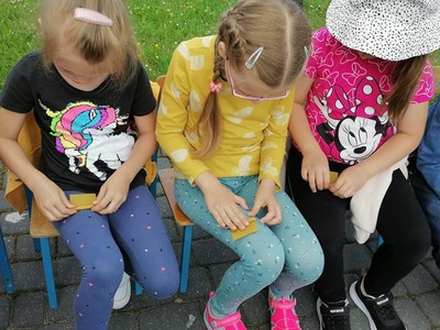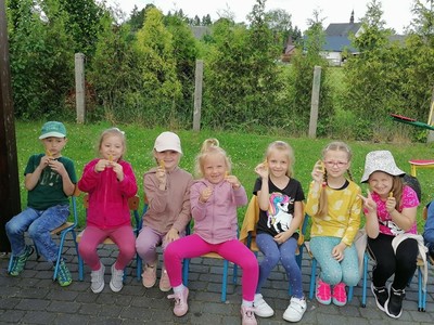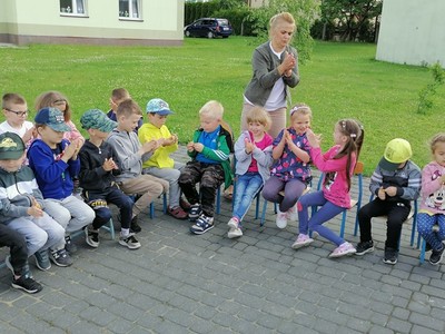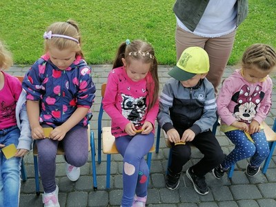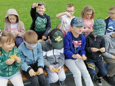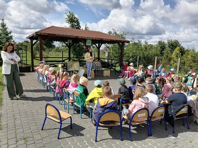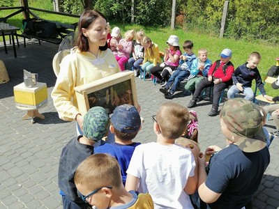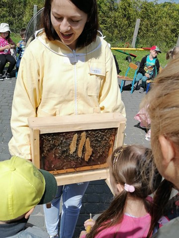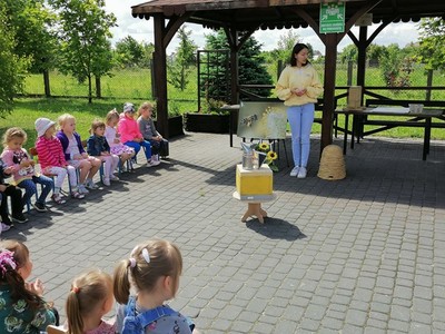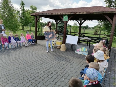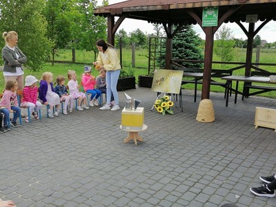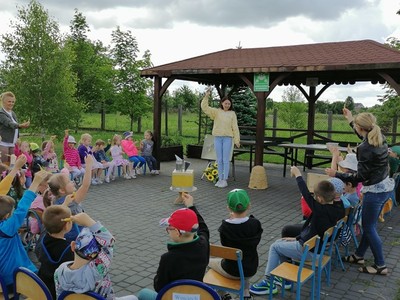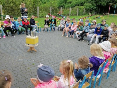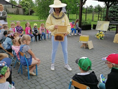 14 czerwca w naszym przedszkolu zostały zorganizowane warsztaty na temat pszczelarstwa i życia pszczół. Zajęcia połączone były z masą atrakcji i świetną zabawą. Żywy ul! – tak w naszym ogrodzie przedszkolnym zagościły żywe pszczółki razem z królową matką. Dzieci dowiedziały się jak pracuje pszczelarz, jak należy dbać o pszczoły, a prowadzącą ubrana była w profesjonalny strój bartnika oraz zaprezentowała naszym milusińskim pszczelarskie akcesoria. Dzieci miały okazję zajrzeć do środka pszczelej rodziny i poznać jej zwyczaje. Własnoręcznie wykonały świecę, a osłodą na zakończenie spotkania był słoiczek miodu.
