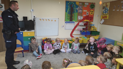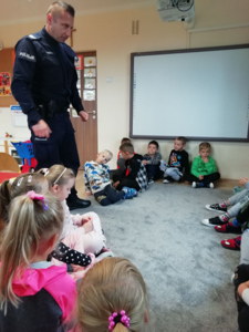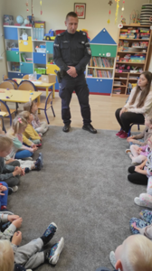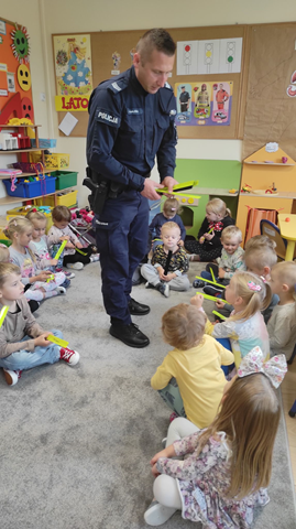 22 września 2022 roku nasze przedszkole odwiedził dzielnicowy z Komisariatu Policji w Małogoszczu, który przybliżył dzieciom podstawowe zasady bezpiecznego poruszania się po drogach oraz przypomniał numery alarmowe. Jednak największym zainteresowaniem cieszyła się prezentacja wyposażenia policyjnego, niezbędnego podczas wykonywania pracy policjanta. Dzieci dzieliły się także swoimi doświadczeniami, pokazały, że są odpowiedzialne i wiedzą, jak należy się zachowywać na drodze i w najbliższym otoczeniu.