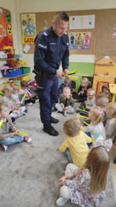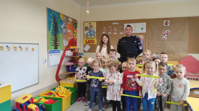 Dziękujemy Panu policjantowi sierż. szt. Łukaszowi Balińskiemu za wspaniałe przeżycia i przybliżenie tak odpowiedzialnego zawodu, jakim jest zawód policjanta oraz ofiarowanie naszym przedszkolakom opasek odblaskowych, aby dzieci mogły bardziej bezpiecznie poczuć się na drodze.
