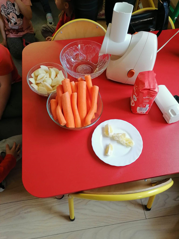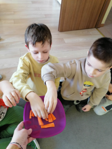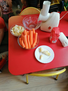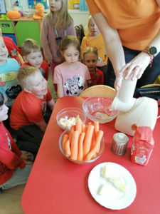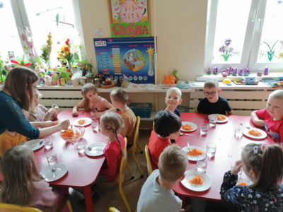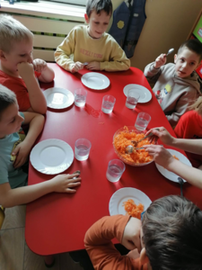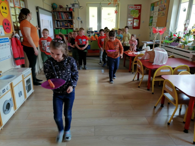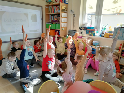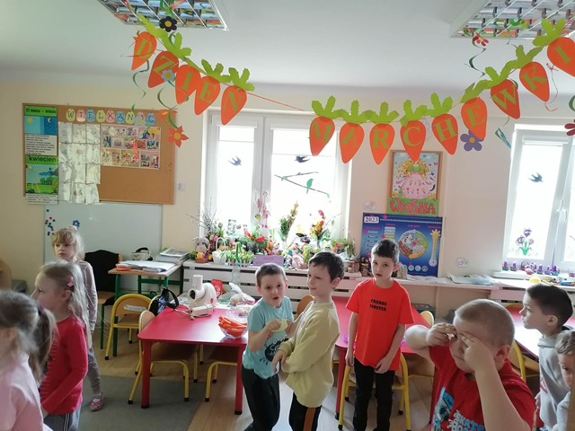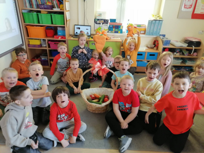 W środę 5 kwietnia w naszym przedszkolu w grupie Słoneczka dzieci obchodziły ,,Dzień Marchewki”. Na początek został odczytany list od królika Szarusia do naszych starszaków. W liście napisał, że przygotował dla nich kilka zadań do wykonania. Dzieci musiały ułożyć napis ,,Dzień Marchewki”, wysłuchać wiersza i zagadek, na które prawidłowo odpowiadały, nauczyć się rymowanki oraz ułożyć puzzle. Opisywały wygląd marchewek, przeliczały je, segregowały. Nie obyło się bez konkurencji czyli biegu z marchewką na talerzu, zabawie ruchowej ,,Marchewka parzy”, tańcach przy piosence ,,Urodziny Marchewki” oraz zabawie badawczej ,,Marchewki w koszyku”. Oglądały również bajki, z których dowiedziały się jak należy siać marchewkę i dbać o nią oraz , że jedzenie warzyw i owoców jest bardzo zdrowe. Na koniec zajęć przygotowaliśmy surówkę marchewkowo-jabłkową, która szybko znikała z talerzy.