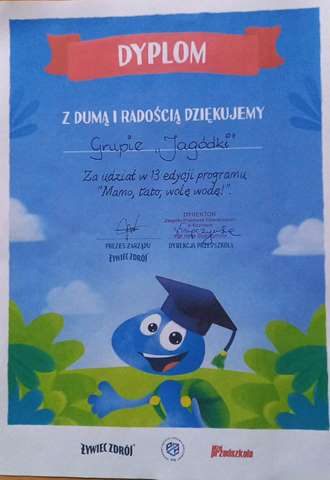 Grupa Jagódki otrzymała certyfikat za udział w 13 edycji programu „Mamo tato wolę wodę”.