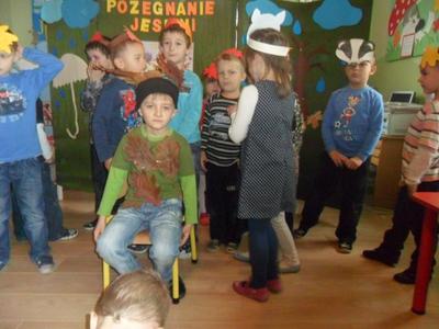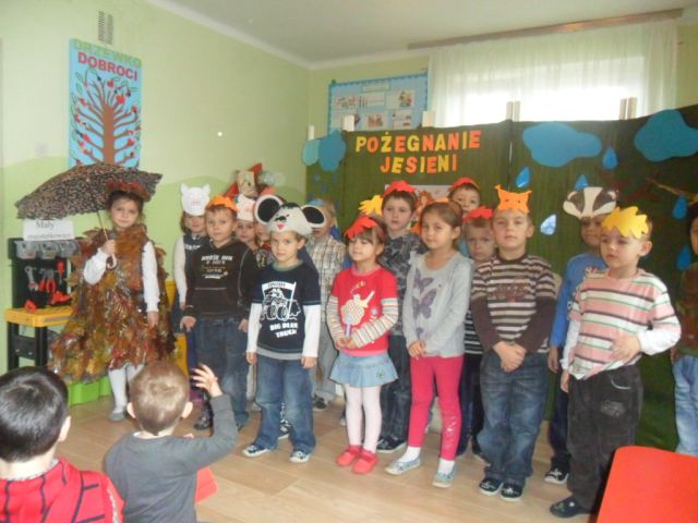 Dnia 23 listopada grupa dzieci 5-6 letnich przedstawiła program artystyczny wspominający piękną złotą jesień recytując wiersze, śpiewając piosenki, przedstawiając inscenizację ,,Przyszła Jesień z koszem darów” oraz ,,O dębie, co żołędzie rozdawał”Na  uroczystość zostali zaproszeni uczniowie klasy I Szkoły Podstawowej w Kozłowie wraz z wychowawcą i grupa młodsza ,,Krasnoludki”.