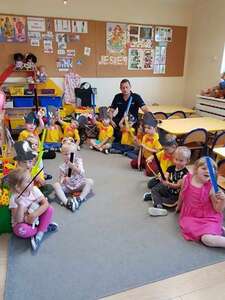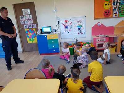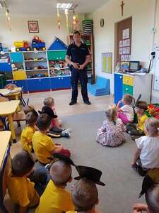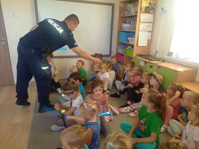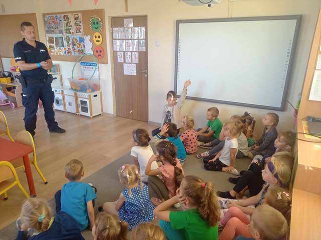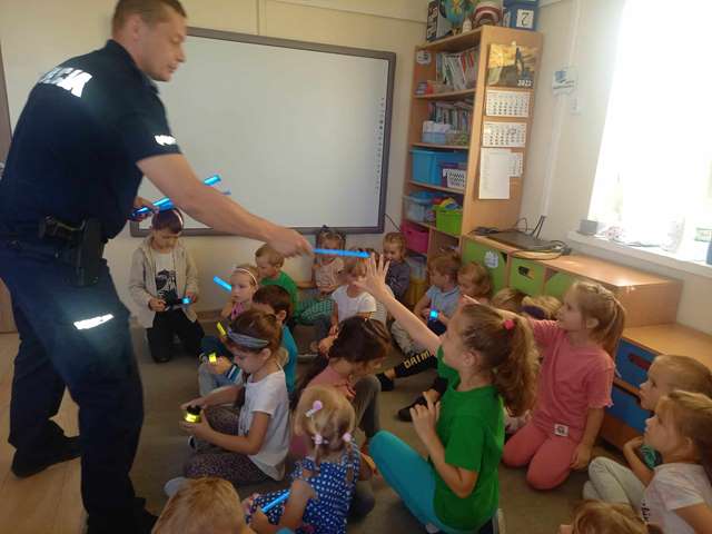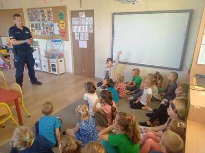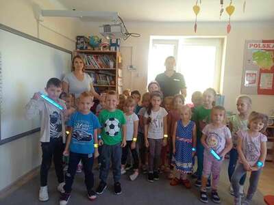 Dnia 29 września przedszkolaków odwiedził asp. Paweł Blicharski z Komisariatu Policji w Małogoszczu. Pan policjant opowiedział przedszkolakom jak bezpiecznie poruszać się po drogach, co należy robić gdy nie zagubimy się w tłumie i dlaczego nie wolno rozmawiać z nieznajomymi. Rozdał również opaski odblaskowe.