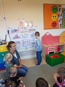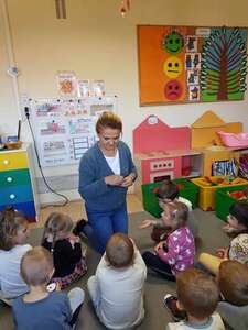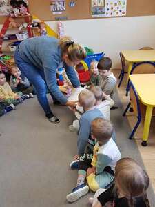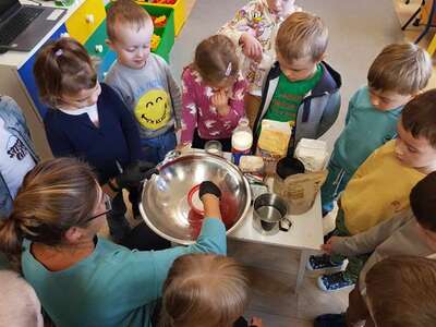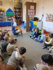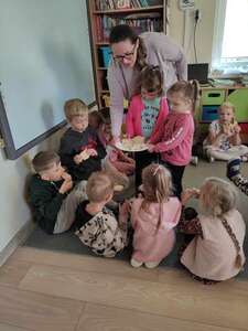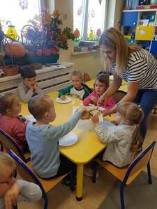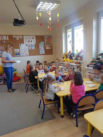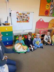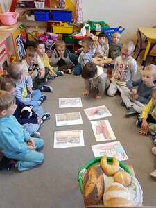 Dnia 17 października grupa ,,Pszczółki” obchodziła Dzień Chleba. Jak powszechnie wiadomo chleb w naszej tradycji ma ogromne znaczenie. Celem naszego święta było przybliżenie przedszkolakom wiadomości na temat historii powstawania chleba i jednocześnie uświadomienie ich, że chleb należy traktować z szacunkiem. Podczas zajęć dzieci dowiedziały się w jaki sposób powstaje chleb słuchając historyjki obrazkowej oraz oglądając film edukacyjny pt. „Od ziarenka do bochenka”. Poznały etapy pracy produkcji chleba oraz uświadomiły sobie, że chleb jest wynikiem ciężkiej pracy wielu ludzi. Poznały składniki potrzebne do przygotowania chleba, obserwowały wyrabianie ciasta jak rośnie i jak się piecze. Na koniec przedszkolaki chętnie zajadały się świeżym chlebem, który wspaniale zarumienił się w przedszkolnym piekarniku. Chlebem maluszki podzieliły się ze starszymi kolegami. Na koniec zajęć poznaliśmy zabawę integracyjną przy muzyce „Mało nas do pieczenia chleba”.