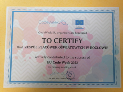 Nasze przedszkole otrzymało certyfikat za udział w Europejskim Tygodniu Kodowania CodeWeek 2023.