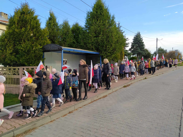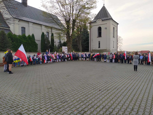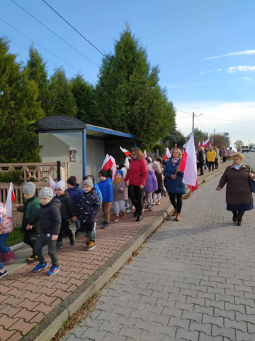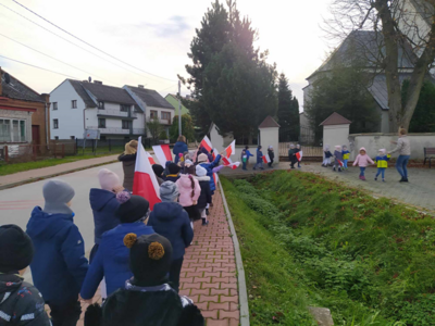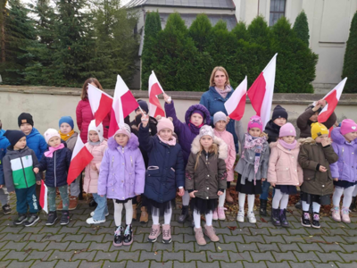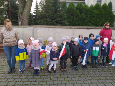10 listopada 2023r. nasze przedszkole wzięło udział w akcji „Szkoła do hymnu”. Przedszkolaki wraz z uczniami Szkoły Podstawowej i nauczycielami przeszli na plac przedszkolny i odśpiewali hymn narodowy.